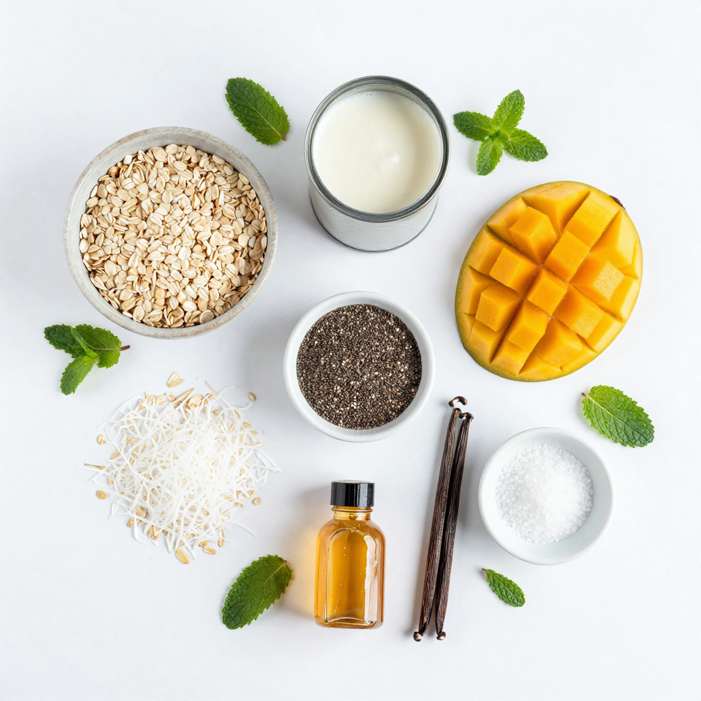 To make Mango Coconut Overnight Oats, you will need simple and fresh ingredients. Here’s what you should gather: