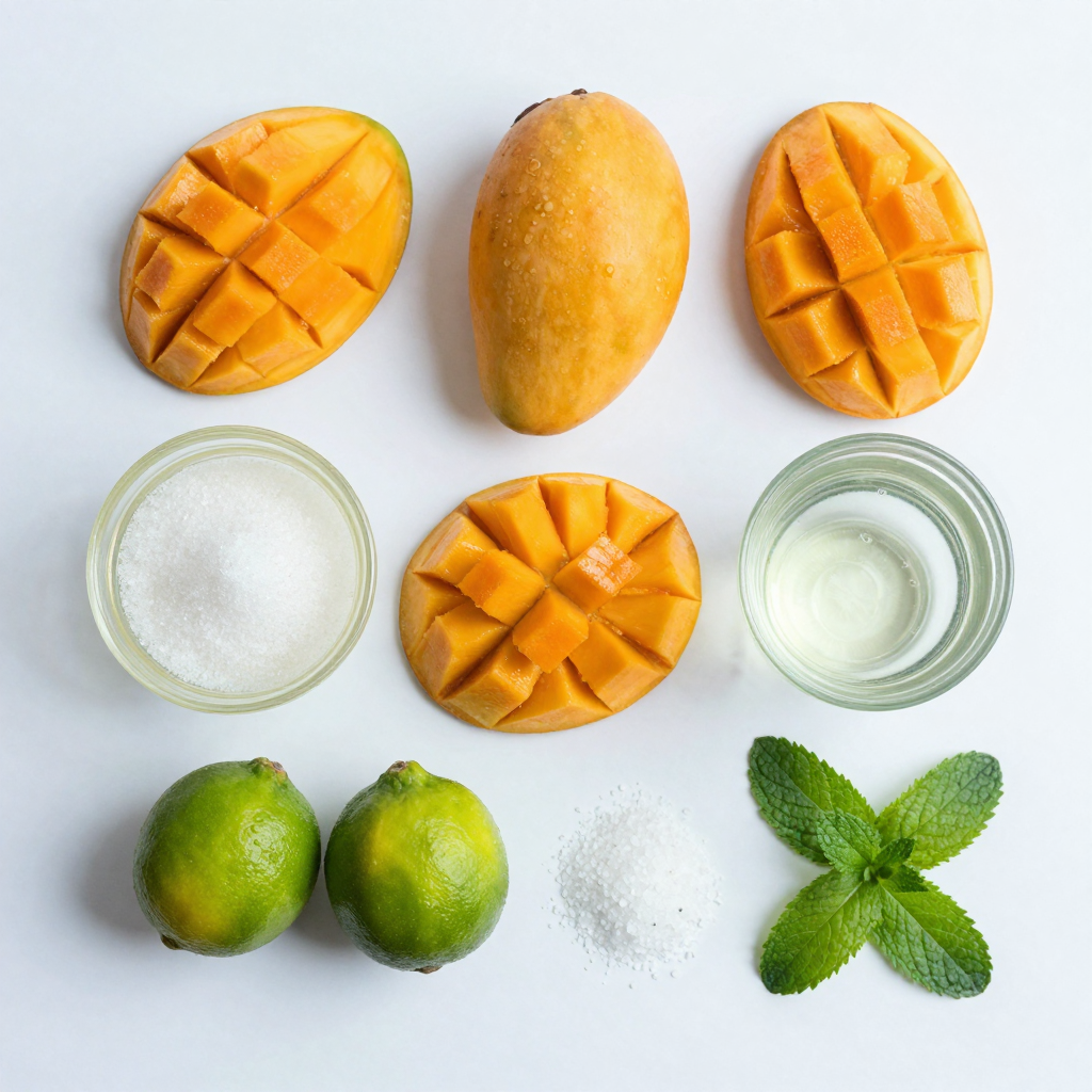 1. First, gather your ingredients: ripe mangoes, fresh lime juice, sugar, coconut water, lime zest, and salt.