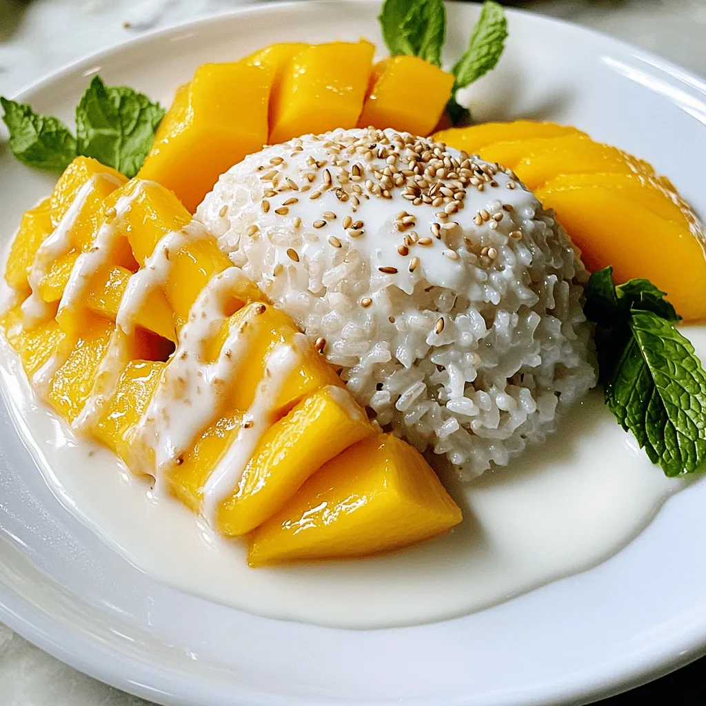 - 1 cup sticky rice (glutinous rice) - 1 ½ cups coconut milk - ½ cup sugar - ½ teaspoon salt - 2 ripe mangoes, peeled and sliced - Toasted sesame seeds or mung beans for garnish (optional) - Fresh mint leaves for garnish (optional) For this recipe, you need precise amounts. Use 1 cup of sticky rice. Measure 1 ½ cups of coconut milk. Add ½ cup of sugar and ½ teaspoon of salt. You’ll need 2 ripe mangoes for sweetness. Optional garnishes are toasted sesame seeds and fresh mint leaves. If you can't find sticky rice, you can use jasmine rice. For dairy-free options, replace coconut milk with almond milk. Use honey instead of sugar if you want a natural sweetener. If you don’t have fresh mangoes, try using canned mango slices. They work well too! First, rinse the sticky rice in cold water. Keep rinsing until the water is clear. This step removes extra starch. Next, soak the rice in water for 4 hours or overnight. Soaking makes the rice soft and chewy. After soaking, drain the rice. Then, place it in a steamer basket lined with cheesecloth or a clean towel. Steam the rice over boiling water for 30 to 40 minutes. The rice should be tender and translucent when done. While the rice cooks, grab a small saucepan. Combine the coconut milk, sugar, and salt in it. Warm this mixture over medium heat. Stir constantly until the sugar dissolves. Be careful not to let it boil. Set aside ¼ cup of the mixture for later. This will be used to drizzle over the dish. Once the rice is cooked, transfer it to a mixing bowl. Pour the remaining coconut milk mixture over the rice. Stir gently until the rice is well coated. Let it sit for 15 minutes to absorb the flavors. To serve, mold the sticky rice using a cup or small bowl. Place it on a serving plate beside the sliced mangoes. Drizzle the reserved coconut milk mixture over the rice. If you like, sprinkle toasted sesame seeds or mung beans on top. Finish by garnishing with fresh mint leaves for a pop of color. To make sticky rice, start by rinsing it well. Rinse the rice until the water is clear. This removes excess starch. Next, soak the rice for at least four hours or overnight. Soaking helps the rice cook evenly. When ready, drain it and use a steamer basket lined with cheesecloth. Steam the rice for about 30 to 40 minutes. The rice should be tender and look slightly translucent. This method gives you that perfect chewy texture. One common mistake is not soaking the rice long enough. This can lead to uneven cooking. Another error is cooking the rice without rinsing it first. This can make the rice too sticky. Avoid using too much water during steaming. You only need enough steam for cooking. Lastly, do not skip letting the rice absorb the coconut milk. This step is key to getting great flavor. To boost flavor, add a little more salt to the coconut milk mix. This helps balance the sweetness of the mango. Drizzling the reserved coconut milk on top adds a nice touch. You can also sprinkle toasted sesame seeds or mung beans for crunch. For a pop of color, garnish with fresh mint leaves. These small details make your dish look beautiful and taste even better. {{image_2}} You can easily make mango sticky rice vegan. Use coconut milk as your only liquid. The sugar you choose should be plant-based. Most sugar works, but check the label to be sure. This way, everyone can enjoy this sweet treat. Mango sticky rice is naturally gluten-free. The sticky rice and coconut milk have no gluten. Always check any added ingredients, like sugar, to ensure they are gluten-free. This dessert fits well in a gluten-free diet. Get creative with how you serve this dish! You can layer sticky rice and mango in cups for a fun look. Try adding a scoop of ice cream on top for a twist. You can also sprinkle some toasted coconut for extra texture. Use fresh mint leaves to make your plate pop with color. Each time, you can create a new look! To keep leftover mango sticky rice fresh, let it cool first. Place it in a container with a lid. Store it in the fridge. It will stay good for about 2-3 days. If you want to keep it longer, consider freezing it. Just remember, the texture may change when thawed. I suggest using airtight containers to store your mango sticky rice. Glass containers work great. They help keep moisture in and prevent odors. If you use plastic, choose BPA-free containers. Always seal them well. This keeps your dessert fresh and tasty. When you’re ready to enjoy your mango sticky rice, reheat it gently. You can use a microwave for this. Place the rice in a bowl and add a splash of coconut milk. Cover the bowl with a damp paper towel to keep it moist. Heat it in short bursts, stirring in between. You can also reheat it on the stove with a little coconut milk. This method keeps the rice soft and delicious. Mango sticky rice is a Thai dessert. It features sweet sticky rice topped with ripe mango. The dish gets its creaminess from coconut milk. It balances sweetness, saltiness, and freshness. Each bite is a delight of flavor and texture. Yes, you can make mango sticky rice ahead of time. Prepare the sticky rice and coconut milk mixture in advance. Store them separately in the fridge. Assemble the dish just before serving for the best taste. You can find authentic mango sticky rice at Thai restaurants. Look for places that focus on traditional Thai food. Street vendors in Thailand also serve great versions. They often use fresh, ripe mangoes for added flavor. You can use many fruits in this recipe. Try bananas, strawberries, or jackfruit. Kiwi and pineapple also work well. Be creative and mix your favorite fruits for a unique twist! In this post, we covered how to make delicious mango sticky rice. We discussed the key ingredients, detailed step-by-step cooking instructions, and shared tips for perfecting the dish. You learned about variations, storage tips, and answered common questions. Remember, with the right ingredients and techniques, making this dessert is easy. Don’
