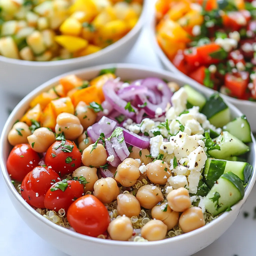 The Mediterranean Chickpea Power Bowl packs a punch with its healthy and tasty ingredients. You will need: - Chickpeas (1 can - 15 oz) - Quinoa (1 cup cooked) - Fresh Vegetables (1 cup cherry tomatoes, halved; 1/2 cucumber, diced; 1/4 red onion, finely chopped; 1/2 red bell pepper, diced) - Additional Toppings (1/4 cup Kalamata olives, pitted and halved; 1/4 cup feta cheese, crumbled; 1/4 cup fresh parsley, chopped) - Dressing Ingredients (3 tablespoons olive oil; 2 tablespoons lemon juice; 1 teaspoon dried oregano; salt and pepper to taste) Chickpeas are the star of this bowl. They are rich in protein and fiber. They help you feel full and energized. Quinoa adds a nutty flavor and is gluten-free. The fresh vegetables bring color and crunch. Cherry tomatoes offer sweetness, while cucumber and bell pepper add freshness. Red onion gives it a nice bite. For the toppings, Kalamata olives add a briny taste, and feta cheese brings creaminess. Fresh parsley adds a bright touch. The dressing is simple yet flavorful. Olive oil and lemon juice create a zesty base. Dried oregano ties it all together. Salt and pepper enhance every bite. This bowl is not just tasty; it is also good for you. Each ingredient plays a role in making this dish a true power bowl. Now you are ready to boost your energy with this delicious meal! {{ingredient_image_1}} - Combining the main ingredients Start by taking a large mixing bowl. Add in the rinsed and drained chickpeas. Then, add cooked quinoa, halved cherry tomatoes, diced cucumber, finely chopped red onion, diced red bell pepper, and halved Kalamata olives. Mix them well. This step builds the base for your bowl. - Making the dressing In a small bowl, whisk together olive oil, lemon juice, dried oregano, salt, and pepper. This dressing brings the flavors together. Make sure it is well-combined for the best taste. - Tossing the ingredients together Pour the dressing over the chickpea mixture. Toss gently to coat all the ingredients evenly. This step ensures every bite is full of flavor. Be careful not to mash the chickpeas. - Incorporating feta and parsley Gently fold in crumbled feta cheese and chopped parsley. These additions add a fresh taste and a nice touch. They bring a lovely creaminess and herbiness to the bowl. - Adjusting seasoning before serving Taste the mixture and adjust the seasoning. Add more salt, pepper, or lemon juice if needed. This step makes sure your bowl is just right. You can serve it right away or chill it for a bit to let the flavors blend. Letting the bowl chill helps the flavors mix well. When you let it sit, the taste deepens. I suggest you chill it for about 15 to 20 minutes. It makes a big difference. For a bright look, garnish with extra parsley and lemon slices. These touches make your bowl pop. They add color and freshness. Using fresh herbs boosts the flavor. Parsley adds a nice touch, but you can also try mint or dill. Fresh herbs can change the whole dish. To cook quinoa perfectly, rinse it first. This removes bitterness. Use two cups of water for each cup of quinoa. Bring it to a boil, then simmer until water is gone. Fluff it with a fork when done. Rinsing and draining chickpeas is key. This removes excess salt and starch. It keeps your bowl light and fresh. When chopping vegetables, try to keep sizes even. This helps them cook and look nice together. Use a sharp knife for clean cuts, and take your time. A steady hand makes all the difference. Pro Tips Use Fresh Ingredients: Always opt for the freshest vegetables and herbs to enhance the flavor and nutritional value of your power bowl. Customize Your Bowl: Feel free to add or substitute ingredients based on your preferences—avocado, roasted vegetables, or grilled chicken make great additions. Make Ahead: This power bowl can be prepared in advance and stored in the refrigerator for up to three days; just add the feta cheese and parsley before serving. Experiment with Dressings: Try different dressings like tahini or yogurt-based ones for a unique flavor twist each time you make the bowl. {{image_2}} You can change the feta cheese if you want. Try using goat cheese or even avocado for a creamy touch. These options add a different flavor while keeping it tasty. Feel free to switch up the vegetables, too. You can use bell peppers, shredded carrots, or even spinach. Each choice adds its own crunch and color, making your bowl more fun. For the dressing, you can replace olive oil with avocado oil or use plain yogurt instead of lemon juice. This change keeps the dish light but gives it a new twist. If you want a vegan version, skip the feta cheese. You can add nuts or seeds for a creamy texture. Tofu is another great option that adds protein. To make it gluten-free, use rice or millet instead of quinoa. Both grains work well and keep the bowl filling and nutritious. Looking to lower the carbs? You can swap quinoa for cauliflower rice. This keeps the dish low-carb while still being delicious. Store your Mediterranean Chickpea Power Bowl in an airtight container. This keeps it fresh and tasty. Place it in the fridge right after serving. It can stay fresh for up to four days. If you're unsure, always check for any off smells or changes in texture. When you reheat, use the microwave or a skillet. Heat it on low to keep the veggies crisp. Add a splash of olive oil or lemon juice for extra flavor. This will help maintain the bowl's freshness. Prep your ingredients ahead of time to save time during the week. Rinse and drain the chickpeas, chop the veggies, and cook the quinoa in advance. Store each ingredient separately in the fridge. Portion out the ingredients for quick meals. Use small containers to hold enough for one serving. This makes grabbing a healthy meal easy and fast. For long-term storage, you can freeze the chickpeas and cooked quinoa. This way, you can enjoy them later. Just remember to thaw them in the fridge overnight before using. Enjoy your power bowl anytime! Chickpeas ar
