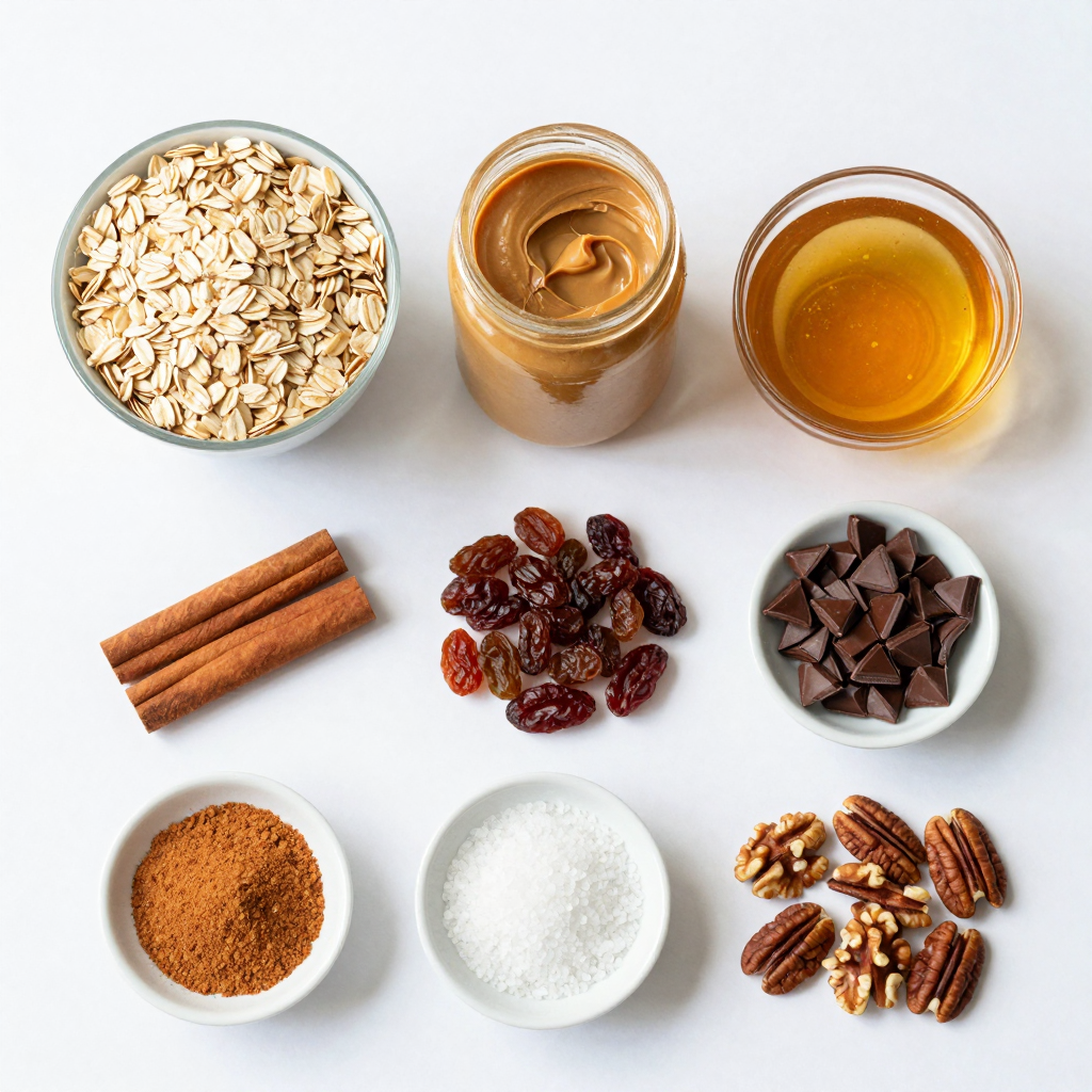 These ingredients are simple and wholesome. Rolled oats give a nice base. Almond butter adds creaminess and protein. Honey or maple syrup provides natural sweetness. Raisins bring chewiness and flavor. If you love chocolate, mini chocolate chips are a fun touch. Cinnamon adds warmth and depth, while salt enhances all the flavors. Lastly, chopped nuts add a delightful crunch.