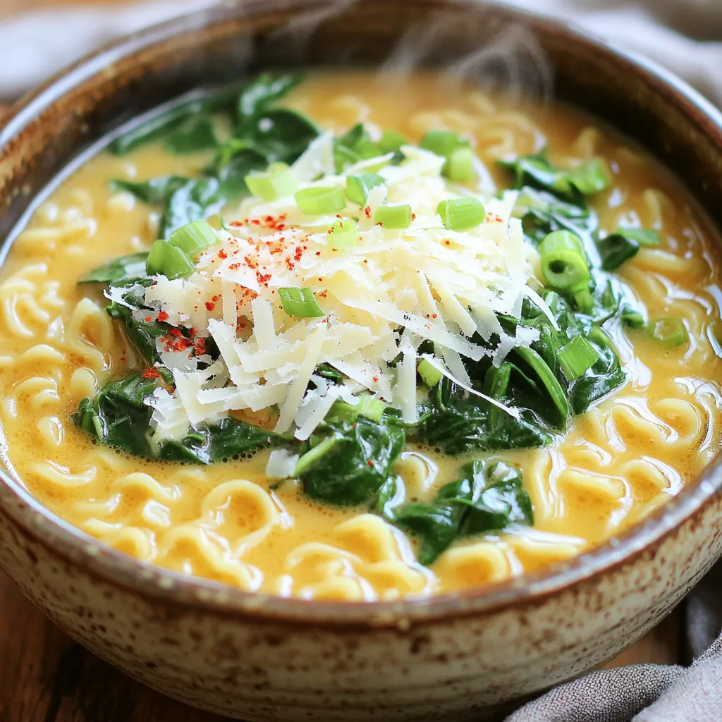 After the noodles are cooked, stir in the soy sauce and crushed red pepper flakes. Mix well to blend the flavors. Next, add in the grated Parmesan cheese. Stir to melt it into the broth. This gives the ramen a creamy texture. Just before you finish, toss in the baby spinach. Stir until it wilts. Then, taste the ramen. Add salt and black pepper as needed. Serve hot in bowls and top with chopped green onions for a fresh finish.