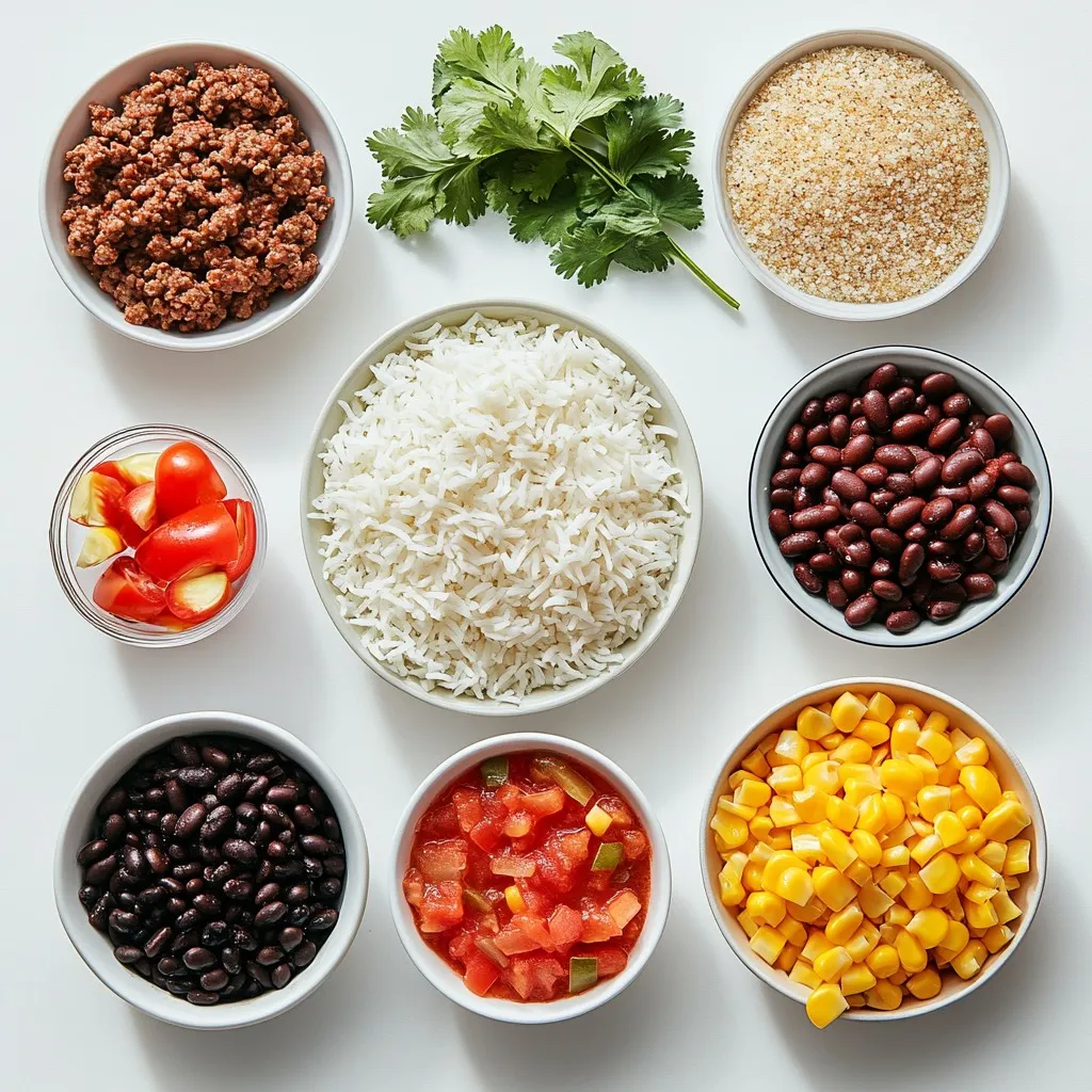 - 1 lb ground beef or turkey - 1 cup long-grain white rice, rinsed - 1 can (15 oz) black beans, drained and rinsed - 1 can (15 oz) diced tomatoes with green chilies - 1 cup corn kernels (fresh, frozen, or canned) - 1 small onion, diced - 2 cloves garlic, minced - 2 tablespoons taco seasoning (store-bought or homemade) - 2 cups chicken or vegetable broth - 1 tablespoon olive oil - Salt and pepper to taste - 1 cup shredded cheddar cheese - Fresh cilantro, for garnish (optional) I love using fresh and simple ingredients in my One Pot Taco Rice. The ground beef or turkey brings richness, while the rice absorbs all the tasty flavors. Black beans add protein and fiber, making this dish hearty. Diced tomatoes with green chilies add spice and sweetness. You can use fresh corn, frozen, or canned corn for texture. Onion and garlic are key for building a strong base. They bring a nice aroma and flavor. Taco seasoning ties everything together with its warm spices. I prefer using chicken or vegetable broth for depth. Olive oil helps sauté the onion and garlic, giving a smooth finish. Don't forget the salt and pepper! They enhance all the flavors. Shredded cheddar cheese melts into the dish, adding creaminess. Finally, fresh cilantro on top adds a burst of freshness. With these ingredients, you create a dish that is both simple and full of flavor. It’s an easy comfort food everyone will enjoy. {{ingredient_image_1}} 1. Sautéing onion and garlic: Start by heating olive oil in a large pot over medium heat. Add the diced onion and sauté for about 3-4 minutes until it turns soft and clear. Next, add the minced garlic. Cook it for one more minute. Stir it constantly to prevent it from burning. 2. Browning the meat: Now, add the ground beef or turkey to the pot. Use a wooden spoon to break it up. Cook for about 5-7 minutes until it turns brown. Season with salt and pepper to taste. 3. Adding taco seasoning: Once the meat is browned, sprinkle in the taco seasoning. Stir well, making sure the meat is fully coated in those spicy flavors. 4. Stirring in rice and beans: Add the rinsed long-grain white rice, black beans, diced tomatoes (with their juices), corn, and broth to the pot. Mix everything together until well combined. 5. Simmering process: Bring the mixture to a boil. Then, reduce the heat to low and cover the pot. Let it simmer for about 20 minutes. This allows the rice to cook and absorb most of the liquid. Stir occasionally to keep it from sticking to the bottom. 6. Adding cheese and fluffing rice: After 20 minutes, check if the rice is tender. If it is, remove the pot from heat. Stir in the shredded cheddar cheese until it melts and mixes in. Finally, fluff the rice with a fork. You can garnish with fresh cilantro if you like. Serve hot and enjoy! To prevent sticking and burning, choose a large pot. This gives you room to stir. Use medium heat while cooking. Stir often, especially when adding the rice and beans. This helps keep everything from sticking to the bottom. If you notice it starting to stick, add a little more broth to loosen things up. When adjusting cooking times, check the rice at the 15-minute mark. If it’s still hard, cover and simmer a bit longer. Each stove is different, so times may vary. Just be sure to keep an eye on it. You can customize spice levels by adding more or less taco seasoning. If you like it spicy, add some cayenne pepper or chopped jalapeños. For a milder taste, use less seasoning. You can also try a different blend of spices to change the flavor. For toppings, think outside the box! Sour cream, guacamole, or salsa can add a nice touch. Fresh avocado or sliced green onions also work well. You can even sprinkle some crushed tortilla chips on top for crunch. Pro Tips Use Lean Meat: Opt for lean ground beef or turkey to keep the dish healthier while still being flavorful. Custom Taco Seasoning: Make your own taco seasoning by combining chili powder, cumin, paprika, and garlic powder for a personalized touch. Rice Variety: If you're feeling adventurous, swap long-grain rice for brown rice or quinoa for added nutrition and a different texture. Extra Toppings: Enhance your taco rice by adding toppings like avocado, sour cream, or jalapeños for extra flavor and creaminess. {{image_2}} You can easily swap the ground beef or turkey for chicken. Simply use one pound of diced chicken breast. Cook it until it's no longer pink. For plant-based options, try using lentils or a meat substitute. These choices add great flavor and texture. For a vegetarian or vegan dish, skip the meat and use extra beans. Black beans or pinto beans work well. You can also use tofu crumbles for added protein. This keeps the meal filling and nutritious, while still being easy to make. If you're looking to mix things up, try using brown rice instead of white rice. Brown rice adds more fiber and has a nutty flavor. Just remember it may take longer to cook; about 45 minutes instead of 20. Quinoa is another great choice. It cooks quickly and has a light, fluffy texture. You can also switch the beans. If you want a different taste, use kidney beans or chickpeas. Each type of bean will add its own unique flavor to the dish. Don’t be afraid to experiment! To keep your One Pot Taco Rice fresh, store it in the fridge. Use airtight containers to prevent moisture loss. Let the dish cool first, then transfer it to the container. You can store leftovers for up to three days. For longer storage, consider freezing it. When freezing, use freezer-safe containers. Leave some space at the top, as the rice will expand. Label the container with the date. This way, you can keep track of how long it’s been stored. You can reheat One Pot Taco Rice in the microwave or on the stovetop. For the microwave, place a portion in a bowl. Add a splash of broth or water to keep it moist. Cover with a microwave-safe lid or wrap. Heat in short bursts, stirring in between, until hot. For the stovetop, add the rice to a pan. Po