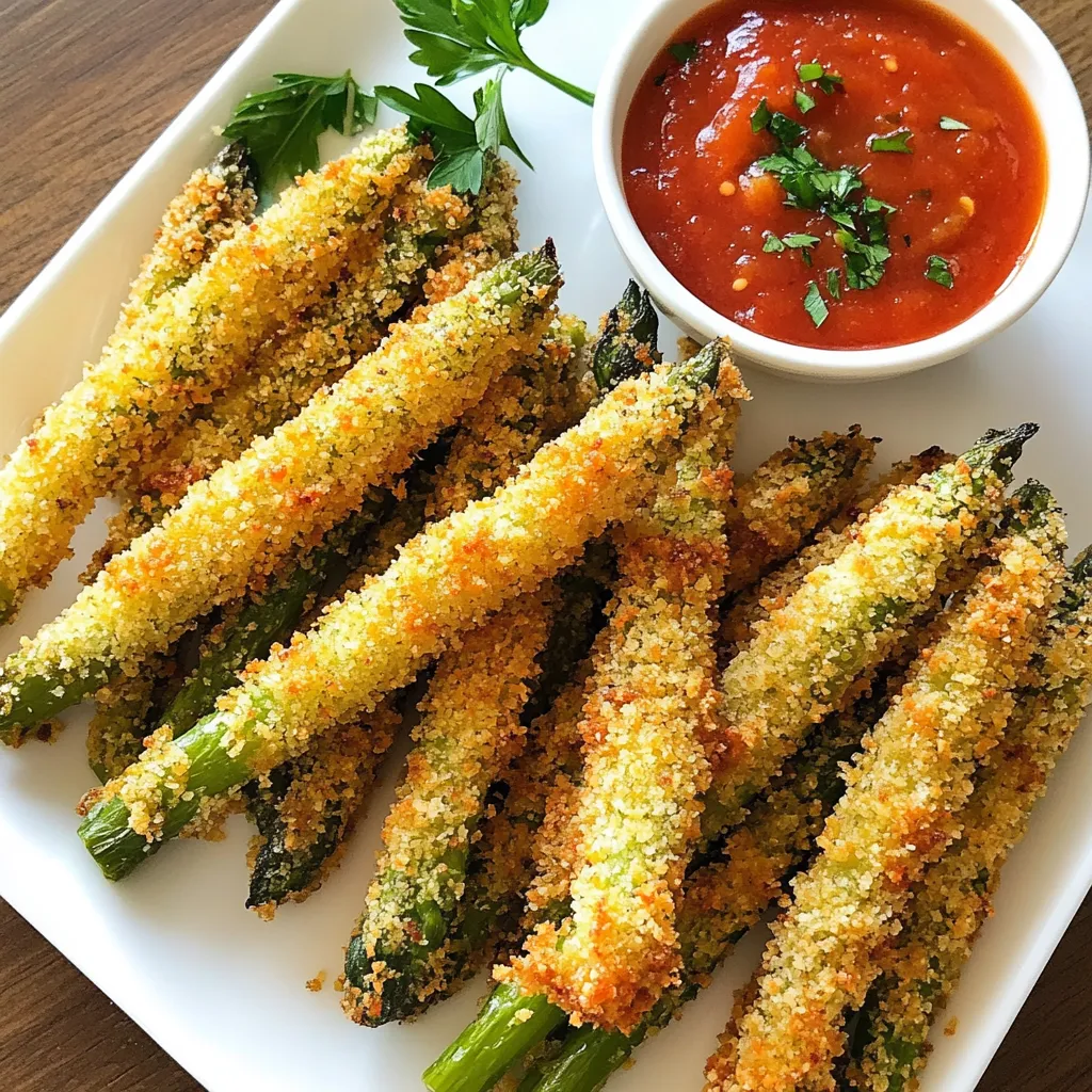 I love serving these fries with a dipping sauce. You can use marinara or ranch dressing. To make the dish look nice, arrange the asparagus fries on a platter. Sprinkle fresh parsley on top for color. Enjoy your delicious snack!