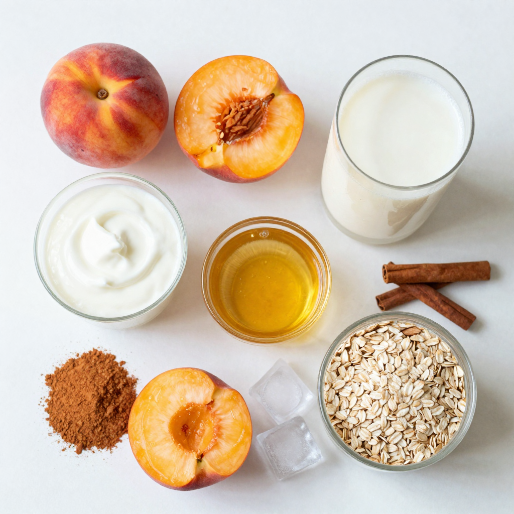 - In a blender, combine the diced peaches, Greek yogurt, almond milk, honey, ground cinnamon, nutmeg, rolled oats, and vanilla extract.