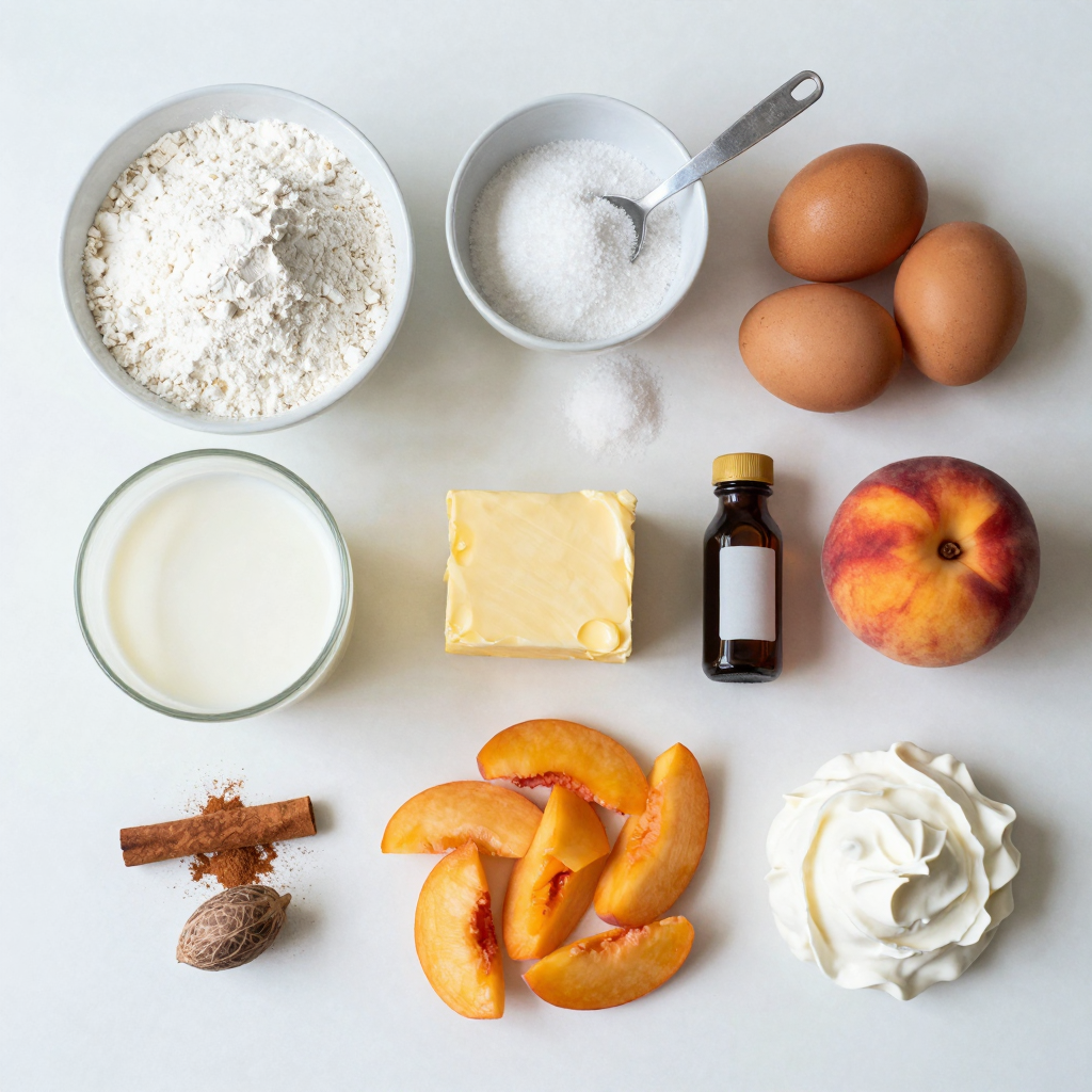 To start, gather all your ingredients. You will need flour, sugar, baking powder, salt, buttermilk, eggs, melted butter, vanilla, peaches, cinnamon, and nutmeg.