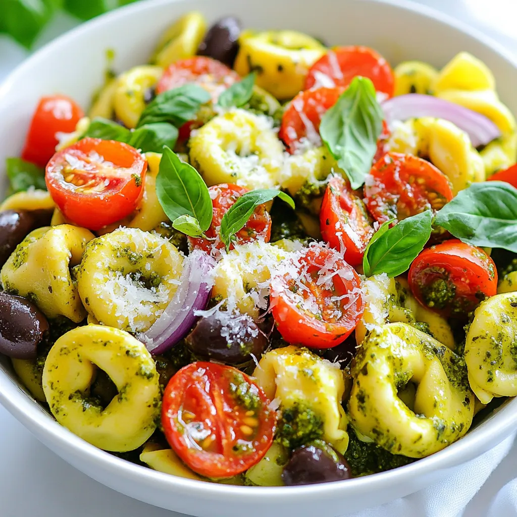 - 12 oz cheese tortellini - 1 cup cherry tomatoes, halved - 1 cup spinach, roughly chopped - 1/2 cup olives, sliced (green or black) - 1/4 cup red onion, finely chopped - 1/2 cup pesto sauce - 1/4 cup grated Parmesan cheese - 2 tablespoons olive oil - Salt and pepper to taste - Fresh basil leaves for garnish The cheese tortellini serves as the star of this dish. It brings a rich, cheesy flavor and a delightful texture. Cherry tomatoes add a sweet burst. Their bright color makes the salad pop. Spinach gives a fresh crunch and a vibrant green hue. Olives add a briny taste. They balance the flavors well. Red onion brings a sharp bite that complements the other ingredients. Pesto sauce ties everything together. It gives the salad a herby, nutty flavor. Olive oil adds richness and helps blend the ingredients. Finally, Parmesan cheese adds a savory finish. If you can’t find cheese tortellini, try using plain pasta. Bowtie or penne work well. For a lighter touch, use zucchini noodles instead. Instead of cherry tomatoes, diced bell peppers add a nice crunch. Swap spinach for arugula or kale for a different flavor. If you dislike olives, try artichoke hearts or capers. For a nut-free option, use a dairy-free pesto or make your own. If you want a creamier salad, mix in some cream cheese or Greek yogurt. {{ingredient_image_1}} Start by boiling water in a large pot. Make sure to add a good pinch of salt. Once the water boils, add 12 oz of cheese tortellini. Cook it according to the package, usually 3-5 minutes. You want the tortellini to be al dente. After cooking, drain the tortellini and rinse it under cold water. This cools it down and stops the cooking. In a large mixing bowl, combine the cooled tortellini with other fresh ingredients. Add 1 cup of halved cherry tomatoes, 1 cup of roughly chopped spinach, and 1/2 cup of sliced olives. You can use green or black olives based on your taste. Finally, add 1/4 cup of finely chopped red onion. Gently mix everything together to ensure even distribution. For the dressing, grab a small bowl. Whisk together 1/2 cup of pesto sauce and 2 tablespoons of olive oil. The oil makes the dressing smooth and rich. Once mixed, pour the pesto dressing over your salad. Gently toss it to coat all the ingredients. Season with salt and pepper to taste. Top with 1/4 cup of grated Parmesan cheese. Let the salad sit for 15-20 minutes. This allows the flavors to blend and become even tastier. Before serving, add fresh basil leaves for a lovely touch. To cook cheese tortellini perfectly, use a large pot. Bring salted water to a boil. Add the tortellini and watch them closely. Cook for 3 to 5 minutes until they are al dente. Drain the tortellini and rinse them under cold water. This stops the cooking and keeps the pasta firm. To boost flavor, use fresh ingredients. Fresh cherry tomatoes and spinach make a big difference. Olives add a nice salty kick. Red onion gives a sweet crunch. When mixing in the pesto sauce, blend it well with olive oil. This helps coat every piece of tortellini. Taste the salad before serving. Adjust salt and pepper to your liking. A sprinkle of grated Parmesan cheese adds a rich finish. Lastly, don’t forget fresh basil leaves for a pop of flavor. Serve the pesto tortellini salad cold or at room temperature. It makes a great side dish for grilled meats or fish. You can also serve it as a light main course. If you want to impress guests, add a simple green salad on the side. This dish is perfect for picnics or potlucks. For extra fun, serve it in a large bowl with a ladle. This way, everyone can help themselves! Pro Tips Perfectly Cook Tortellini: Ensure you cook the tortellini until al dente for the best texture. Overcooking can make them mushy. Customize Your Greens: Feel free to substitute spinach with arugula or kale for a different flavor profile and added nutrients. Add Protein: For a heartier salad, consider adding grilled chicken, shrimp, or chickpeas to make it a complete meal. Make It Ahead: This salad can be made a day in advance. Just add the fresh basil right before serving to keep it vibrant. {{image_2}} You can add many vegetables to your pesto tortellini pasta salad. Try bell peppers for some crunch. Zucchini adds a nice, fresh flavor. Carrots bring a bit of sweetness. You can even toss in some peas for a pop of color. Just remember to chop them small, so they mix well with the tortellini. Want to make your salad heartier? Consider adding protein. Grilled chicken works great with the pesto. Shrimp can add a nice touch too. For a vegetarian option, try chickpeas or white beans. These will give you a boost of energy. Just mix them in after you combine the veggies and tortellini. If you want to change the flavor, try different sauces. You can use sun-dried tomato pesto for a tangy twist. A spinach or arugula pesto can add a fresh taste. You can even make a creamy version with Greek yogurt. Just blend the yogurt with herbs to create a smooth sauce. Each option gives your salad a new flair. After enjoying your pesto tortellini pasta salad, store any leftovers in an airtight container. Make sure to cool the salad to room temperature first. This keeps the flavors fresh and prevents sogginess. Refrigerate the container for up to three days. If you want to keep it longer, consider freezing it. However, the texture may change after thawing. To reheat the salad, take it out of the fridge. You can eat it cold or warm it up. If you prefer warm pasta salad, place it on the stove over low heat. Stir gently until warm. Avoid high heat; it may dry out the ingredients. If you freeze the salad, thaw it in the fridge before reheating. Pesto tortellini pasta salad is best eaten fresh but lasts well in the fridge. Keep an eye on the ingredients, especially the spinach and tomatoes. If they start to look wilted or slimy, it’s time to toss the salad. Always check for any off smells or changes in texture before eating. Yes, you can make this salad ahead of t