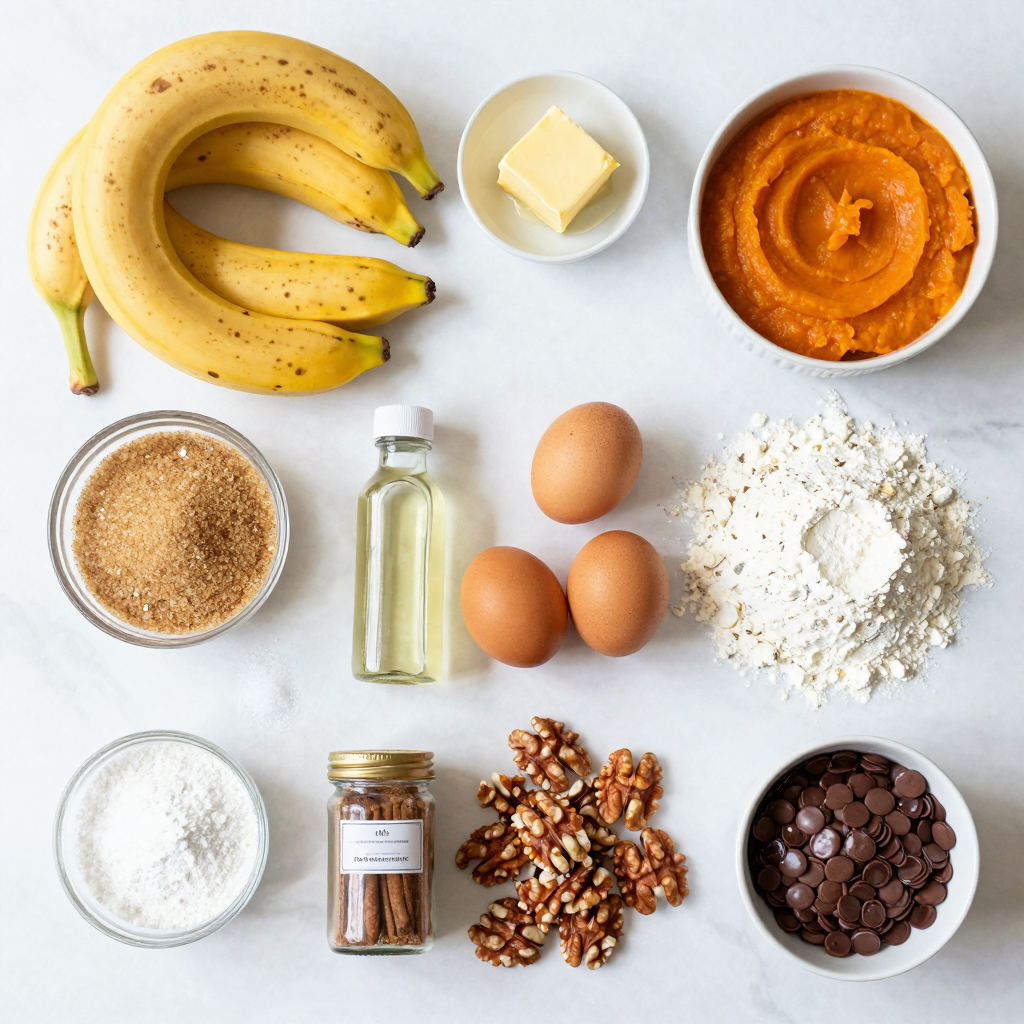 In this recipe, you need ripe bananas and pumpkin puree. Ripe bananas add natural sweetness and moisture. They create a soft texture in the bread. Pumpkin puree gives it a warm flavor and beautiful color.