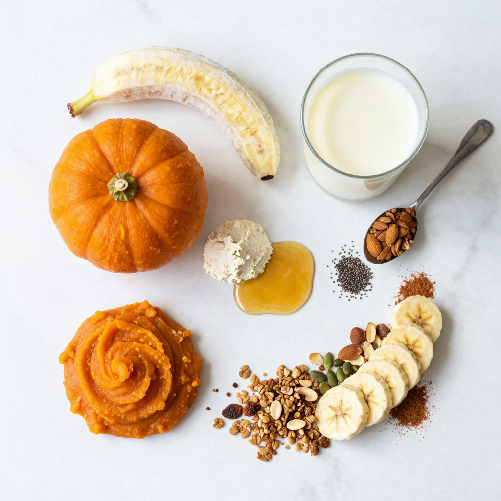 To start, gather your ingredients. You need pumpkin puree, frozen banana, almond milk, vanilla protein powder, pumpkin pie spice, and maple syrup if you want a bit of sweetness.