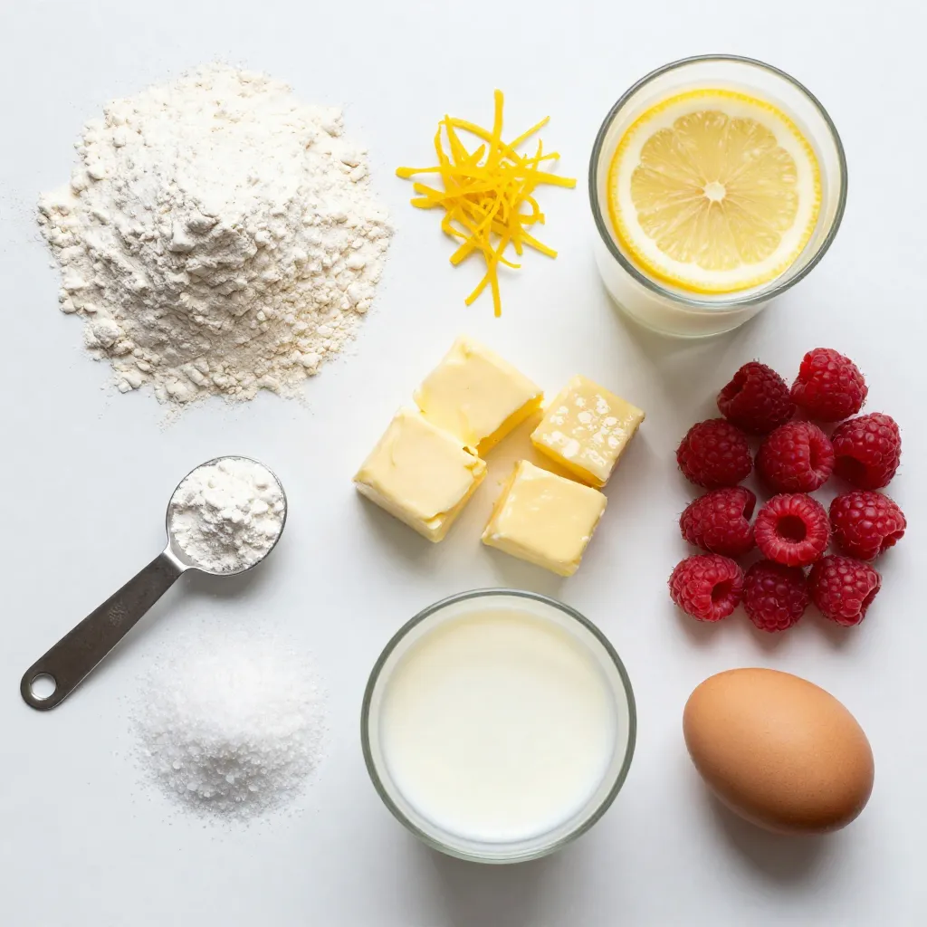 Start by gathering all your ingredients. You need 2 cups of flour, 1/2 cup of sugar, 2 teaspoons of baking powder, and 1/2 teaspoon of baking soda. Don’t forget the 1/4 teaspoon of salt and the zest of 1 lemon. You will also need 1/2 cup of cold, cubed butter and 3/4 cup of buttermilk. Lastly, get 1 cup of fresh raspberries ready. Measure everything out to make the process smooth.