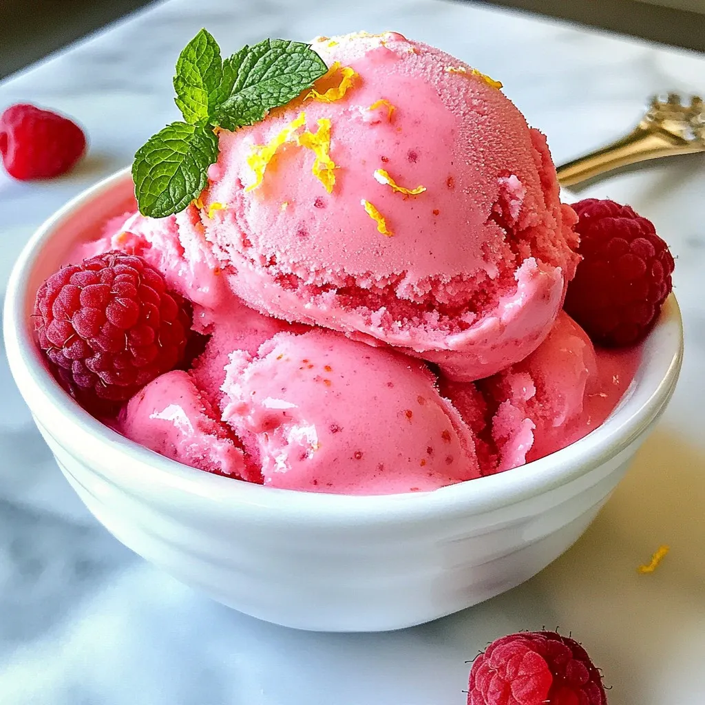 A refreshing sorbet made with fresh raspberries and lemon juice, perfect for hot days.