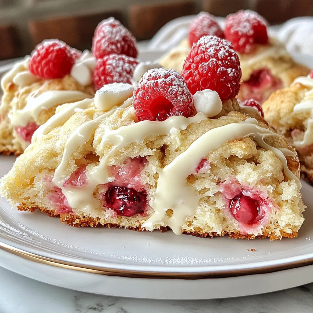 To make Raspberry White Chocolate Scones, gather these ingredients: - 2 cups all-purpose flour - 1 tablespoon baking powder - 1/4 teaspoon salt - 1/4 cup granulated sugar - 1/2 cup unsalted butter, cold and cubed - 1/2 cup heavy cream - 1 large egg - 1 teaspoon vanilla extract - 3/4 cup fresh raspberries - 1/2 cup white chocolate chips - Extra cream for brushing - Raw sugar for sprinkling For the flour, you can use whole wheat flour for a nuttier taste. If you want a dairy-free option, try coconut cream instead of heavy cream. You can swap the white chocolate chips for dark chocolate chips if you prefer a richer flavor. Use frozen raspberries if fresh ones are not available; just be careful not to overmix. Always pick fresh raspberries; they should be firm and bright red. For butter, choose unsalted for better control over the scone's sweetness. Use pure vanilla extract instead of imitation for a more natural taste. When it comes to chocolate, select high-quality white chocolate chips for a creamy melt. These choices will enhance your scones and elevate your baking experience! {{ingredient_image_1}} First, set your oven to 400°F (200°C). This high heat helps the scones rise well. Next, line a baking sheet with parchment paper. This prevents the scones from sticking and makes cleanup easy. In a large bowl, combine 2 cups of all-purpose flour, 1 tablespoon of baking powder, 1/4 teaspoon of salt, and 1/4 cup of granulated sugar. Whisk these dry ingredients together until they mix well. This step ensures that the baking powder spreads evenly. In another bowl, whisk together 1/2 cup of heavy cream, 1 large egg, and 1 teaspoon of vanilla extract. Mix until it looks smooth. Now, pour this wet mixture into the dry ingredients. Stir gently until just combined. Be careful not to overmix. This will keep the scones light and fluffy. Turn the dough onto a floured surface. Shape it into a disc that is about 1 inch thick. Use a sharp knife to cut the disc into 8 wedges. Place each wedge on the prepared baking sheet. Make sure to leave some space between each scone. Brush the tops of the scones with extra cream for a golden finish. Sprinkle raw sugar on top for a nice crunch. Bake for 18-22 minutes. Check for a golden color and a clean toothpick when inserted. Let the scones cool for a few minutes on the baking sheet before moving them to a wire rack. Enjoy them warm for the best taste! To get that soft and fluffy scone, handle your dough gently. Overmixing can ruin the texture. When you mix wet and dry ingredients, stir just until combined. The dough should be a bit sticky. Use cold butter and cream; this helps create layers. One big mistake is using warm butter. Cold butter makes a lighter scone. Another error is not measuring flour correctly. Too much flour can make the scones dry. Avoid pressing the dough too hard when shaping it. Keep it light and airy for the best results. If you have leftover scones, store them in an airtight container. They stay fresh for about two days at room temperature. For longer storage, freeze them. Wrap each scone in plastic wrap and place them in a freezer bag. They last up to three months in the freezer. Just reheat them in the oven when you're ready to enjoy! Pro Tips Use Cold Butter: Make sure your butter is very cold. This helps create flaky layers in the scones as the butter melts during baking. Don’t Overmix: When combining the wet and dry ingredients, mix just until combined. Overmixing can lead to tough scones. Fresh Raspberries: Use fresh raspberries for the best flavor and texture. If using frozen, be careful as they can make the dough too wet. Brush with Cream: Brushing the tops with cream before baking gives the scones a beautiful golden color and a slightly crunchy texture. {{image_2}} You can switch out raspberries for other fruits. Blueberries work great in this recipe. Strawberries also add a nice sweet touch. You could even try diced peaches or cherries. Just make sure the fruit is fresh and ripe. This keeps your scones tasting amazing. While white chocolate is sweet, you can try dark or milk chocolate instead. Dark chocolate gives a rich flavor that pairs well with fruit. Milk chocolate adds extra sweetness, perfect for those who love a sweeter bite. You can mix and match chocolate types for fun flavor combos. To make these scones gluten-free, use a gluten-free flour blend. Look for one that has a good mix of ingredients. For a dairy-free version, swap the butter for coconut oil or a vegan butter. Use almond or oat milk in place of heavy cream. These adaptations keep the scones tasty and enjoyable for everyone! Raspberry white chocolate scones taste amazing with jams. I love to serve them with raspberry jam. It adds a fruity burst that matches the scones. You can also try clotted cream for a rich touch. Honey or lemon curd works too. Each spread adds a unique flavor twist. A warm cup of tea pairs perfectly with these scones. Try a nice Earl Grey or chamomile tea. Coffee is another great choice, especially a smooth latte. If you want something fruity, a berry smoothie is refreshing. Each drink enhances the scone experience. Serve the scones warm for the best taste. I like to dust them with powdered sugar. Place them on a pretty plate to impress your guests. You can also add fresh raspberries on the side. Use a small bowl for jams or clotted cream. The colors and textures make the meal look special. You can tell scones are done when they turn golden brown. A toothpick inserted in the center should come out clean. If it has wet dough on it, give them a few more minutes. The tops should feel firm to the touch. Yes, you can freeze unbaked scones! Shape the scones and place them on a baking sheet. Freeze them for about an hour, then transfer them to a freezer bag. They can last in the freezer for up to three months. When ready to bake, add a few extra minutes to the baking time. To reheat scones, preheat your oven to 350°F (175°C). Place the scones on 