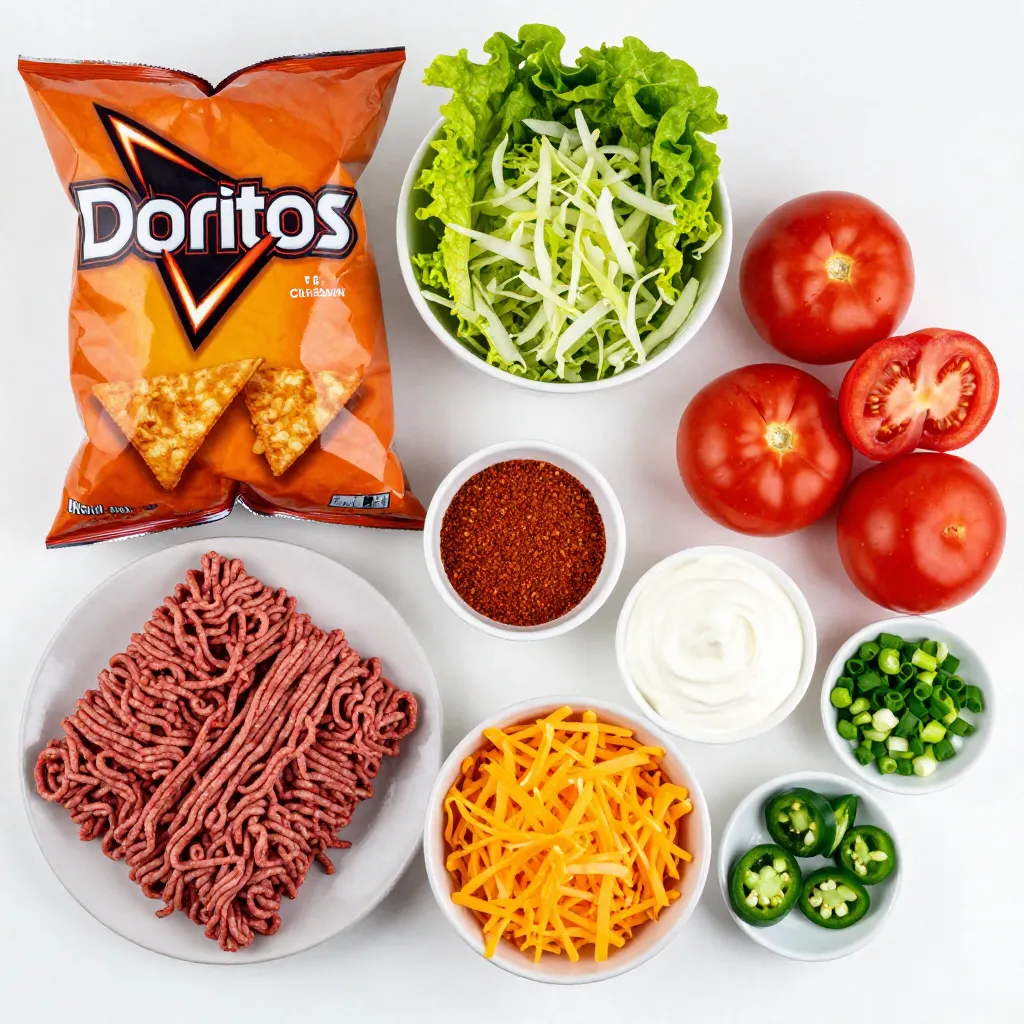 To make these tasty Nacho Cheese Doritos tacos, you need a few simple items. First, grab a bag of Nacho Cheese Doritos. These chips give your tacos a crunchy and cheesy base. Next, choose either ground beef or turkey, depending on your preference. You will need about one pound. Taco seasoning adds flavor to the meat. A packet will work just fine.
