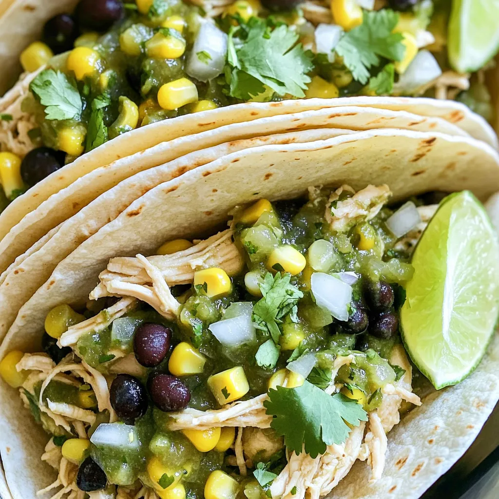 - 2 lbs boneless, skinless chicken breasts - 1 jar (16 oz) salsa verde - 1 can (15 oz) black beans, drained and rinsed - 1 cup corn kernels (fresh, frozen, or canned) - 1 medium onion, diced - 3 cloves garlic, minced - 1 teaspoon cumin - 1 teaspoon chili powder - Salt and pepper to taste - Fresh cilantro, chopped (for garnish) - Lime wedges (for serving) - Bell peppers or jalapeños for extra spice - Avocado for garnish - Chicken alternatives (thighs or tofu for vegetarian) - Low-sodium salsa verde options This dish relies on simple but flavorful ingredients. Start with the chicken. I love using boneless, skinless chicken breasts for their tenderness. Salsa verde adds zest and depth. You can pick your favorite brand or even make your own if you feel adventurous. Next, black beans and corn provide texture and nutrition. They add a nice contrast to the chicken. Diced onion and minced garlic bring out a savory aroma as they cook. The cumin and chili powder elevate the dish with warm spices. Feel free to mix it up! You can add bell peppers for a crunch or jalapeños if you like heat. Avocado is a great topping that adds creaminess. If you prefer, use chicken thighs for a richer flavor or tofu for a vegetarian version. Low-sodium salsa is perfect for those watching their salt intake. - Start by placing 2 lbs of boneless, skinless chicken breasts at the bottom of the slow cooker. - Next, pour 1 jar (16 oz) of salsa verde evenly over the chicken. - Add 1 medium diced onion, 3 minced garlic cloves, 1 can (15 oz) of drained black beans, and 1 cup of corn kernels. - Sprinkle 1 teaspoon of cumin and 1 teaspoon of chili powder on top. - Season with salt and pepper to taste. - Cover the slow cooker with the lid. Set it to cook on low for 6-8 hours or on high for 3-4 hours. - Check the chicken to see if it is fully cooked and tender. - After cooking, take two forks and shred the chicken in the slow cooker. Mix it well with the salsa for more flavor. - Serve the shredded chicken in warm tortillas or over a bed of rice. - You can also add it to salads for a fresh twist. - For garnish, sprinkle chopped fresh cilantro on top and add lime wedges on the side. This method creates a simple yet tasty dish, perfect for any meal. Enjoy! To keep your chicken moist, use boneless, skinless chicken breasts. Cooking on low heat helps lock in moisture. Avoid lifting the lid too often, as this releases steam. Seasoning is key. Use salt and pepper generously to enhance the flavors. The spices like cumin and chili powder add depth and warmth. Prepare this dish ahead of time for busy nights. You can cut the onion and garlic in advance. Store them in the fridge until you're ready to cook. For even more ease, use frozen corn and canned black beans. This saves time without losing flavor. Just rinse the beans before adding them to your slow cooker. To boost the flavor, consider adding fresh herbs like cilantro or oregano. This adds freshness and brightness to the dish. A splash of lime juice right before serving can bring all the flavors together. It adds a zesty touch that makes it pop. Enjoy your flavorful creation with warm tortillas or over rice for a delightful meal! {{image_2}} You can easily make salsa verde chicken in different ways. If you have an Instant Pot, you can use it for faster cooking. Set it to high pressure for 10-12 minutes. This method keeps the chicken juicy and full of flavor. For stovetop cooking, start by browning the chicken in a pan. Then, add salsa and spices. Let it simmer for about 30-40 minutes. This method gives you great control over the heat. To change things up, try different salsas. Mango or pineapple salsa adds a sweet twist. You can also mix in cheese while cooking. Creamy cheeses like Monterey Jack or cheddar melt beautifully into the dish. Feel free to experiment with spices too. Adding smoked paprika or chipotle powder can bring a smoky flavor. Adjust the spices to match your taste. If you want a vegan option, swap the chicken for firm tofu or jackfruit. Use a vegan salsa to keep it plant-based. For gluten-free options, make sure your salsa and other ingredients are certified gluten-free. This recipe is easy to tweak for various diets, making it a great choice for everyone. To store leftovers, let the dish cool to room temperature. Then, transfer it to an airtight container. This keeps the chicken fresh and prevents odors from spreading. Store it in the fridge for up to four days. When reheating, I recommend using the microwave or stovetop. If using the microwave, heat in short bursts. Stir often to ensure even heating. If using the stovetop, add a splash of water to keep it moist. For freezing, place the cooled dish in a freezer-safe container. Make sure to leave some space at the top for expansion. You can freeze it for up to three months. Label the container with the date for easy tracking. When ready to eat, thaw it overnight in the fridge. To reheat, warm it on the stovetop or in the microwave, stirring occasionally. This keeps the flavors intact and ensures even heating. In the fridge, Slow Cooker Salsa Verde Chicken stays fresh for about four days. In the freezer, it lasts up to three months. Always check for signs of spoilage before enjoying leftovers. If it smells off or looks strange, it's best to toss it. Cooking time is key to tasty chicken. On low, it takes 6 to 8 hours. On high, it cooks in 3 to 4 hours. The chicken should be tender and cooked through when done. Always check that it reaches an internal temperature of 165°F. This ensures it is safe to eat. Yes, you can use frozen chicken breasts! Just place them in the slow cooker without thawing. However, increase the cooking time by about an hour. This helps the chicken cook evenly. Make sure to check that it is fully cooked before serving. This dish pairs well with many sides. Here are some ideas: - Warm tortillas for a tasty wrap. - Rice for a hearty base. - Fresh salads to add crunch. - Avocado slices for creaminess