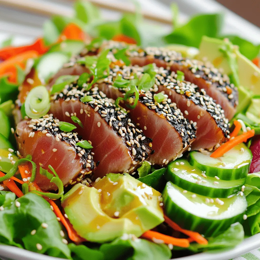 To impress, arrange your salad with care. Use a large plate and layer the greens first. Place sliced tuna on top in a fan shape. Drizzle the dressing in an artistic swirl. Finish with extra sesame seeds and green onions for color. A beautiful presentation makes the dish more inviting.