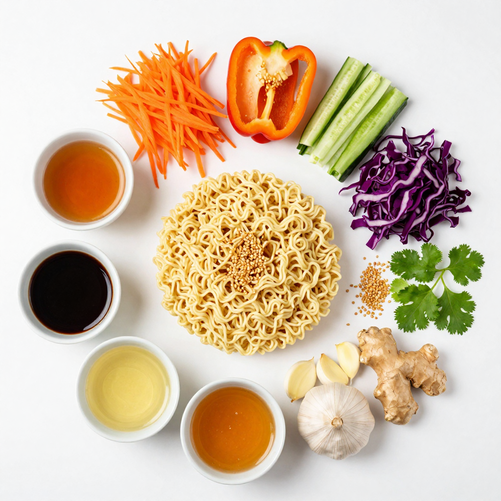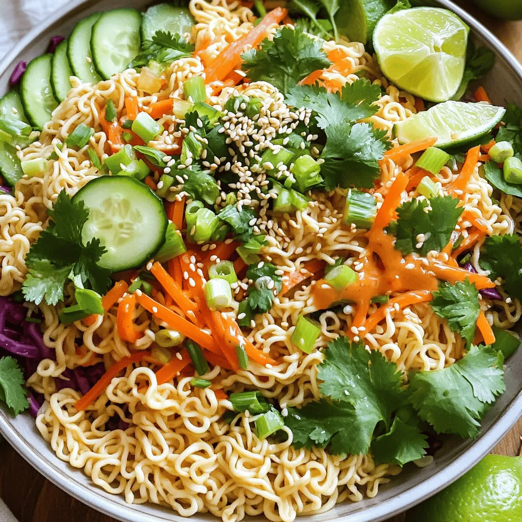 The main ingredients for this salad make it bright and fresh. The ramen noodles form a chewy base. I love using colorful veggies like carrots, bell pepper, cucumbers, and red cabbage. They add crunch and flavor. Green onions bring a mild onion taste that complements the other ingredients. The herbs and seeds, like cilantro and sesame seeds, give it a burst of freshness.