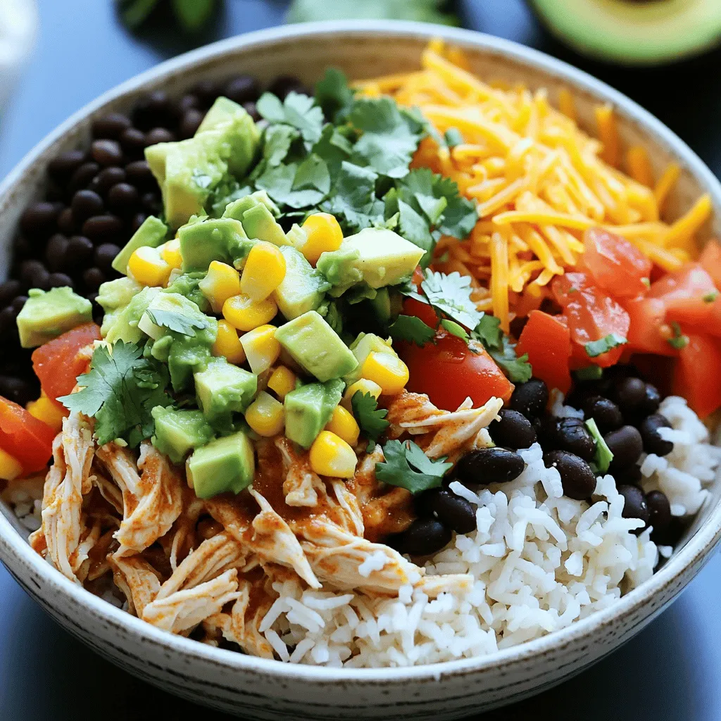 - 1.5 lbs boneless, skinless chicken thighs - 1 can (15 oz) black beans, rinsed and drained - 1 cup corn, frozen or canned - 1 cup diced tomatoes (canned or fresh) - 1/2 cup onion, diced - 2 cloves garlic, minced - 2 tablespoons chipotle chili powder - 1 teaspoon cumin - 1 teaspoon smoked paprika - 1/2 teaspoon salt - 1/4 teaspoon black pepper - 1 cup chicken broth - Juices from 1 lime - Diced avocado - Fresh cilantro - Shredded cheese - Sour cream This recipe is simple and packed with flavor. First, I use chicken thighs because they stay juicy and tender. I add black beans for protein and fiber. The corn gives a sweet crunch, while the diced tomatoes add freshness. Onions and garlic bring depth to the dish. For spices, chipotle chili powder gives a smoky heat. Cumin and smoked paprika add warmth and earthiness. Salt and black pepper enhance all the flavors. The chicken broth adds moisture, and lime juice brightens the dish. Finally, I love to top my burrito bowls with avocado for creaminess, fresh cilantro for brightness, shredded cheese for richness, and sour cream for tang. You can mix and match these toppings based on your taste. - Prep the chicken: Start by placing the boneless chicken thighs at the bottom of the slow cooker. This helps the chicken soak up all the juices. - Add vegetables: Layer the rinsed black beans, corn, diced tomatoes, diced onions, and minced garlic over the chicken. This creates a colorful base for your bowl. - Combine spices: In a small bowl, mix the chipotle chili powder, cumin, smoked paprika, salt, and black pepper. This spice blend gives the dish its bold flavor. - Add liquid: Pour the chicken broth and lime juice over the mixture. This ensures the chicken stays moist as it cooks. - Set cooking time: Cover the slow cooker and cook on low for 6 to 8 hours or high for 3 to 4 hours. The chicken should be tender and shred easily when done. - Shred the chicken: After cooking, use two forks to shred the chicken right in the slow cooker. Mix it with the beans and veggies for even flavor. - Prepare rice: Cook the rice according to package instructions. This will serve as a nice bed for your burrito bowl. - Serve with toppings: Spoon the shredded chicken mixture over the rice. Add your choice of toppings, like diced avocado, fresh cilantro, shredded cheese, and a dollop of sour cream. Enjoy your delicious meal! - To ensure tender chicken, use boneless, skinless thighs. They remain juicy and flavorful. - Layer your ingredients properly. Start with the chicken at the bottom. Then add beans, corn, tomatoes, onions, and garlic. This helps the flavors blend well. - Want more spice? Add a pinch of cayenne pepper or extra chipotle chili powder. - For extra flavors, try adding lime zest or fresh herbs like cilantro before serving. They brighten the dish. - Prep your ingredients in advance. Chop veggies and measure spices the night before. This makes cooking easier. - If you want to make ahead, cook the dish and store it in the fridge. It reheats well in the microwave or on the stove. {{image_2}} You can switch up the protein in this recipe. If you prefer, use turkey or pork. Both work well in these burrito bowls. For a meat-free option, try using tofu or tempeh. They soak up flavors nicely and add good texture. You can also change the beans or veggies. If black beans are not your favorite, use pinto or kidney beans. You can also add more vegetables. Bell peppers, zucchini, or spinach can boost the nutrition and taste. To make this dish gluten-free, ensure all your ingredients are certified gluten-free. Most beans and spices fit this bill. Use gluten-free broth to keep it safe. For vegetarian adaptations, skip the chicken. Replace it with hearty chickpeas or lentils. They will add protein and fiber. Cook them the same way as the chicken, and enjoy a tasty meal. You can mix up the spice blends. Try adding chili powder for more heat or oregano for a fresh twist. If you want it spicier, add diced jalapeños or hot sauce. These add a kick and make your burrito bowl exciting. Feel free to experiment with different toppings. Besides avocado and cilantro, try pickled onions or sliced radishes. They add color and crunch, making your meal more fun to eat. To store leftovers, let the burrito bowls cool. Place them in an airtight container. Keep them in the fridge for up to four days. When ready to eat, check for freshness before reheating. For long-term storage, you can freeze the burrito bowls. Use freezer-safe containers or heavy-duty bags. Make sure to remove as much air as possible. They can last up to three months in the freezer. Label your containers with the date to track freshness. To reheat, the best method is using the microwave. Place the portion in a microwave-safe bowl. Cover it with a lid or a damp paper towel. Heat for 1-2 minutes, stirring halfway through. You can also reheat on the stovetop over low heat. Add a splash of water or broth to keep it moist. Cook until heated through, stirring often. Enjoy your meal! Can I use chicken breasts instead of thighs? Yes, you can use chicken breasts. They will cook quickly and may be drier. Chicken thighs offer more flavor and stay moist during cooking. How do I adjust the recipe for a smaller serving? To serve fewer people, cut the ingredients in half. Use about 0.75 lbs of chicken and adjust beans and rice accordingly. Can I make this recipe in an Instant Pot? Yes, you can! Cook on high pressure for about 10-12 minutes. Make sure to adjust the liquid to keep it moist. Why is my chicken dry? Chicken can dry out if it cooks too long or at too high a temperature. Always check your slow cooker settings. What can I serve with burrito bowls? You can serve burrito bowls with tortilla chips, salsa, or a fresh salad. Add sides like guacamole or corn salad for variety. Can I use fresh corn instead of frozen? Yes, fresh corn works great! Just cut it off the cob and add it to the slow cooker. What type of rice works best with this reci