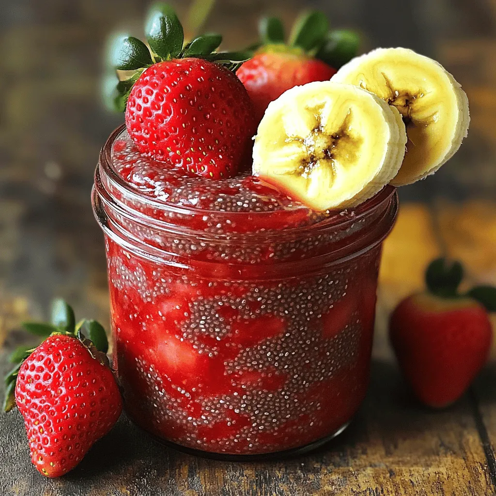 These ingredients come together to create a sweet, fruity jam. Fresh strawberries give a vibrant flavor. The ripe banana adds a creamy texture. Honey or maple syrup sweetens the jam nicely. Chia seeds help thicken it and add fiber. Lemon juice adds a bright kick. The vanilla rounds out the taste with warmth.