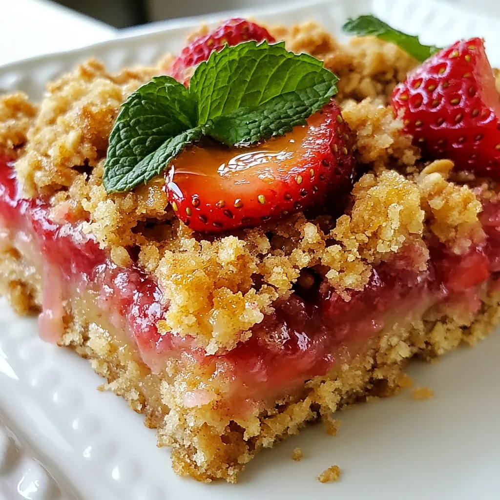 - 2 cups rolled oats - 1 cup whole wheat flour - 1/2 cup brown sugar, packed - 1/2 teaspoon baking soda - 1/2 teaspoon cinnamon - 1/4 teaspoon salt - 1/2 cup coconut oil (or unsalted butter) - 1/4 cup honey or maple syrup - 1 teaspoon vanilla extract - 2 cups fresh strawberries, hulled and chopped - 1 tablespoon cornstarch - 1 tablespoon lemon juice To make strawberry oatmeal bars, gather these simple ingredients. Use rolled oats for a hearty base. Whole wheat flour adds a nutty flavor. Brown sugar gives a touch of sweetness. Baking soda helps the bars rise. Cinnamon and salt enhance the taste. Coconut oil or unsalted butter keeps the bars moist. Honey or maple syrup adds natural sweetness. Don't forget the vanilla extract for extra flavor. Fresh strawberries give a burst of color and taste. Cornstarch thickens the fruit filling. Lemon juice balances the sweetness and brightens the flavors. These ingredients work together to create a snack that is both tasty and healthy. You can find most of them in your pantry. If you want to switch things up, feel free to experiment with different fruits or sweeteners. {{ingredient_image_1}} - Preheat the oven to 350°F (175°C). - Grease or line your 8x8-inch baking dish with parchment paper. This helps with easy removal. - In a large bowl, combine: - 2 cups rolled oats - 1 cup whole wheat flour - 1/2 cup brown sugar, packed - 1/2 teaspoon baking soda - 1/2 teaspoon cinnamon - 1/4 teaspoon salt - Mix these dry ingredients well. This gives your bars a great base. - In another bowl, whisk together: - 1/2 cup melted coconut oil (or unsalted butter) - 1/4 cup honey or maple syrup - 1 teaspoon vanilla extract - Combine this wet mixture with the dry ingredients. Stir until just mixed. - In a small bowl, mix: - 2 cups chopped strawberries - 1 tablespoon cornstarch - 1 tablespoon lemon juice - Toss gently to coat the strawberries. This helps thicken the filling. - Press half of the oat mixture into the bottom of the baking dish. - Evenly layer the strawberry mixture over the base. - Crumble the rest of the oat mixture on top. Spread it evenly. - Bake in the preheated oven for 25-30 minutes. Look for a golden brown top. - Let the bars cool in the dish for at least 15 minutes before slicing. This helps them hold their shape. To get the right texture for your bars, use rolled oats. They bind well and give a nice chew. Mix your dry ingredients well to avoid clumps. Press half the oat mixture firmly into the baking dish. This base layer holds everything together. After baking, let the bars cool for at least 15 minutes. Cooling helps them set. If you cut them too soon, they might crumble. To boost flavor, add spices like nutmeg or ginger. You could also try almond extract for a twist. Serve your bars warm with a drizzle of honey. A scoop of yogurt on the side adds creaminess. Fresh mint leaves on top give a nice pop of color too. If you want less sugar, use half the brown sugar. You could also swap honey for agave nectar. For a fruitier taste, mash some strawberries into the wet mix. This will give the bars a sweeter, berry flavor. Just remember that too much fruit can change the texture. Adjust the oats to balance it out. Pro Tips Use Ripe Strawberries: For the best flavor, make sure to use ripe, sweet strawberries. This will enhance the overall taste of the bars. Chill Before Serving: Let the bars chill in the fridge for a couple of hours after baking. This will help them set up better and make slicing easier. Experiment with Add-Ins: Feel free to add nuts, seeds, or chocolate chips to the oat mixture for extra texture and flavor. Store Properly: To keep the bars fresh, store them in an airtight container at room temperature for up to 3 days, or refrigerate for longer shelf life. {{image_2}} You can easily swap strawberries for other fruits. Blueberries and raspberries work well here. You can even use diced peaches or apples when they are in season. These swaps change the flavor and keep your snack fresh. Want a gluten-free option? Use almond flour or oat flour instead of whole wheat flour. You can also make these bars vegan. Replace honey with maple syrup and use coconut oil instead of butter. These changes keep it healthy and tasty. To add crunch, mix in nuts like walnuts or almonds. Seeds, such as chia or flaxseed, also boost nutrition. For extra protein, fold in a scoop of your favorite protein powder. You can add more oats for a heartier bar. These additions make your snack even better. To keep your strawberry oatmeal bars fresh, store them in an airtight container. This helps prevent them from drying out. If you plan to eat them soon, you can leave them at room temperature for a day. For longer storage, refrigerate them. They stay fresh for about a week in the fridge. If you want to store them even longer, freezing is a great option. Wrap each bar in plastic wrap and place them in a freezer bag. This way, they can last up to three months without losing flavor. When stored properly, your bars can last about one week in the fridge. In the freezer, they can stay good for up to three months. You’ll know they’ve gone bad if they start to smell sour or look discolored. If you see any mold, throw them away. Always trust your senses. Fresh is best! To enjoy your bars warm, you can reheat them in the oven or the microwave. For the oven, preheat it to 350°F (175°C) and place the bars on a baking sheet. Heat for about 10 minutes. In the microwave, heat one bar for 15-20 seconds. This makes them warm and soft again. Serve them with a drizzle of honey for added sweetness. Enjoy your delicious snack! Yes, you can make these bars ahead of time. I often prepare them a day in advance. Store them in an airtight container at room temperature. They stay fresh and tasty for up to three days. If you don't have coconut oil, use unsalted butter. You can also try vegetable oil or even olive oil. These fats work well and keep the bars moist. Look for a golden brown top and bub