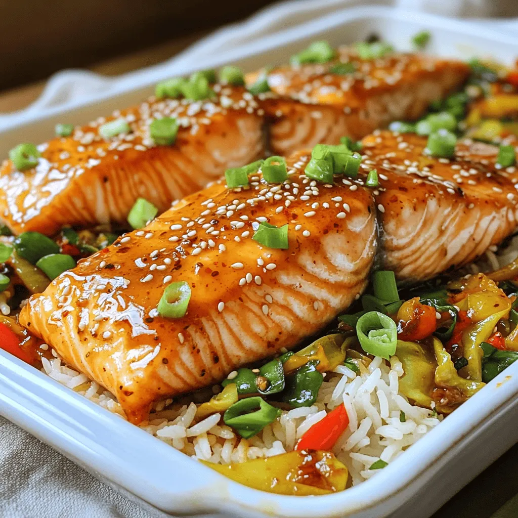 Once the salmon is ready, drizzle the thickened sauce over the fillets. Garnish with sliced green onions and sesame seeds for a touch of color. This dish pairs well with steamed rice or quinoa and sautéed vegetables for a complete meal.