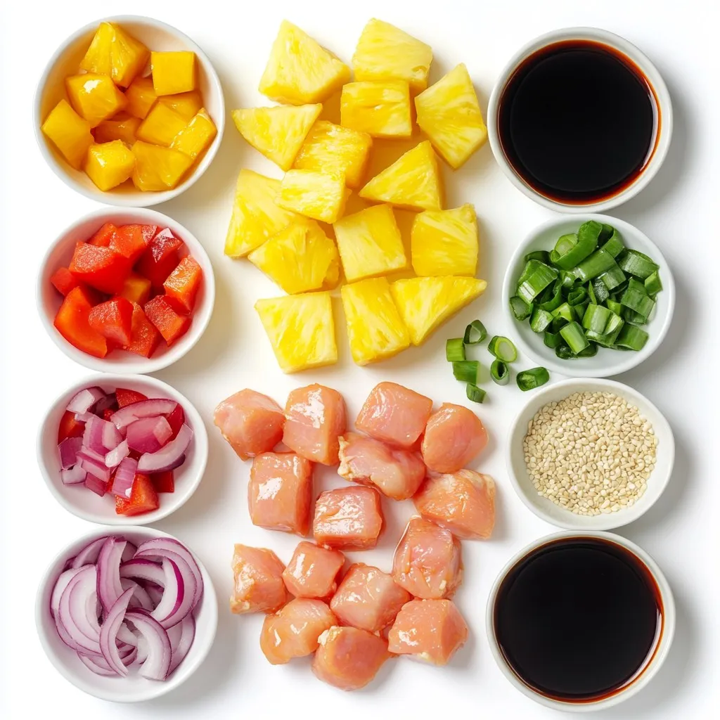 In this dish, chicken breast serves as the main protein. I love using fresh pineapple chunks for sweetness. Bell pepper adds color and crunch, while red onion provides a nice bite. Garlic brings depth to the flavor.