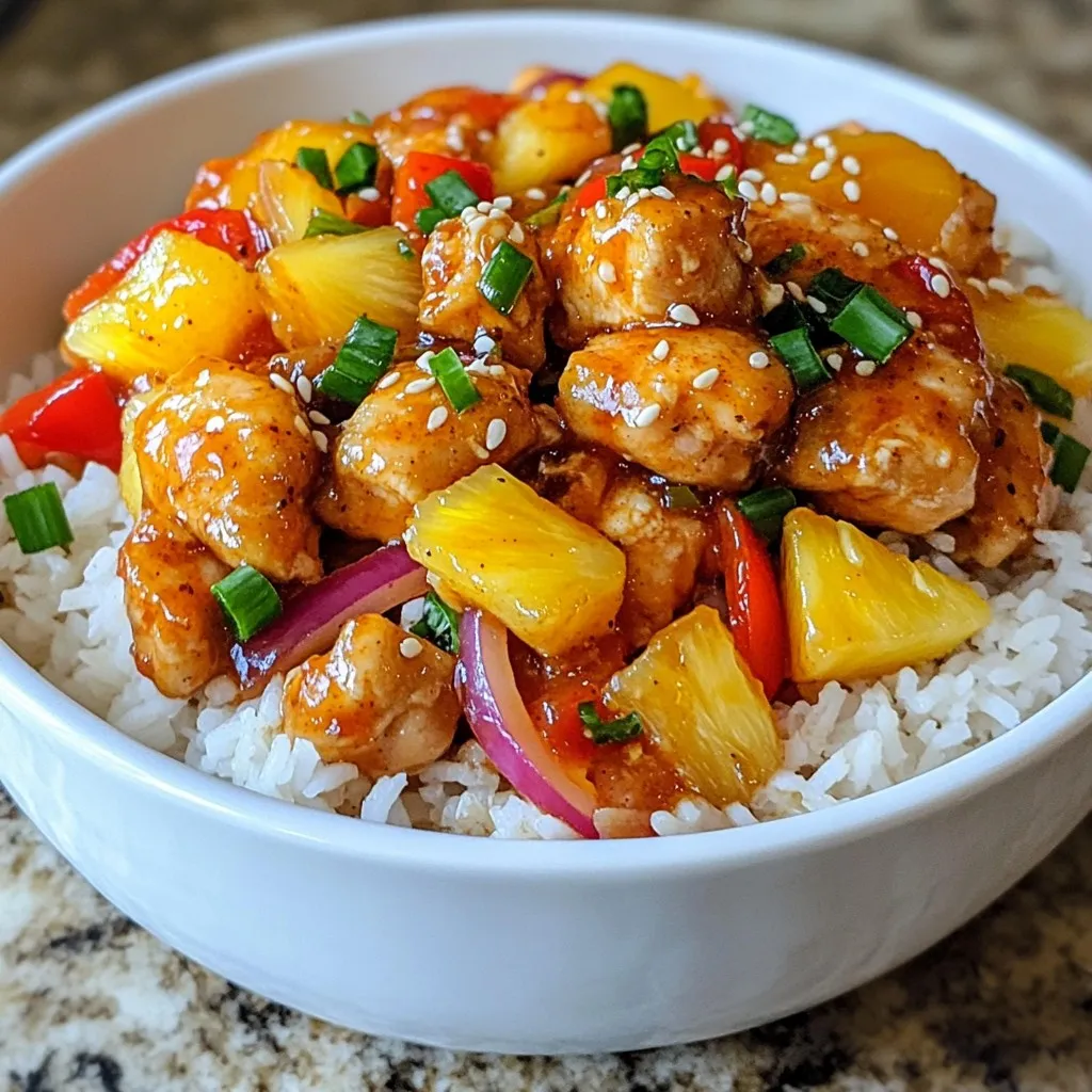 A delicious stir-fry featuring marinated chicken, fresh pineapple, and colorful vegetables, all tossed in a sweet chili sauce.