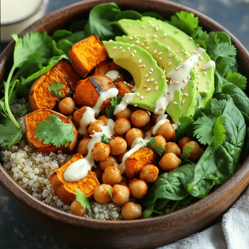 - 2 medium sweet potatoes, cubed - 1 can (15 oz) chickpeas, drained and rinsed - 1 avocado, sliced Sweet potatoes are the star of this bowl. They add natural sweetness and a creamy texture. Chickpeas bring protein and fiber, making the meal filling. Avocado gives a smooth finish and healthy fats. - 1 tablespoon olive oil - 1 teaspoon smoked paprika - ½ teaspoon garlic powder - ½ teaspoon cumin - Salt and pepper, to taste - 2 cups cooked quinoa - ¼ cup tahini - 2 tablespoons lemon juice Olive oil helps roast the sweet potatoes perfectly. The spices bring warmth and flavor. Quinoa serves as a hearty base, while tahini adds creaminess to the dressing. - 1 tablespoon maple syrup (optional for sweetness) - Sesame seeds, for garnish - Fresh cilantro, for garnish Maple syrup can sweeten the tahini dressing. Sesame seeds and cilantro add a fresh touch. Feel free to adjust these add-ins to suit your taste! 1. First, preheat your oven to 400°F (200°C). This helps the sweet potatoes cook well. 2. Next, in a large bowl, toss the cubed sweet potatoes and drained chickpeas. Add 1 tablespoon of olive oil. 3. Sprinkle in 1 teaspoon of smoked paprika, ½ teaspoon of garlic powder, and ½ teaspoon of cumin. 4. Season with salt and pepper to taste. Mix until everything is well-coated. 1. Spread the sweet potato and chickpea mix evenly on a baking sheet lined with parchment paper. 2. Roast in the oven for 20-25 minutes. Stir the mixture halfway through. This ensures even cooking. 3. Look for tender sweet potatoes that are slightly crispy on the edges. This gives a nice texture. 1. While the veggies roast, prepare your dressing. In a bowl, whisk together ¼ cup of tahini, 2 tablespoons of lemon juice, and maple syrup if you want extra sweetness. 2. Add enough water (about 2-4 tablespoons) to reach your desired consistency. Set the dressing aside. 3. In your serving bowls, layer 2 cups of cooked quinoa. Add a handful of baby spinach on top. 4. Next, pile on the roasted sweet potatoes and chickpeas. 5. For creaminess, arrange sliced avocado on top. 6. Drizzle the tahini dressing over the bowl, and sprinkle sesame seeds and fresh cilantro as a final touch. To achieve the perfect roast for your sweet potatoes and chickpeas, follow these steps: - Cut your sweet potatoes into even cubes. This helps them cook at the same rate. - Use a hot oven at 400°F (200°C). This gives them a nice crispy edge. - Spread them out on the baking sheet. This allows hot air to circulate around each piece. - Stir halfway through roasting. This ensures even cooking and browning. For fluffy quinoa, make sure you: - Rinse the quinoa before cooking. This removes the bitter coating. - Use a 2:1 water-to-quinoa ratio. This keeps it light and airy. - Let it rest after cooking. Cover it and let it sit for 5 minutes. Then fluff with a fork. To adjust your tahini dressing texture, keep these tips in mind: - Add water slowly. Start with 2 tablespoons and mix well. - Check the thickness. If it’s too thick, add more water until you reach your desired consistency. For flavor enhancements in your dressing, consider: - Adding garlic or ginger. This will boost the flavor profile. - Mix in herbs like parsley or dill. Fresh herbs add a bright taste. For ideal toppings that add flavor, I suggest: - Sliced almonds or walnuts. They add crunch and nutrition. - Feta cheese or crumbled goat cheese. This adds a creamy, salty bite. To customize this Buddha bowl based on dietary preferences: - Use quinoa or brown rice. Both are great base options. - Add protein sources like lentils or tofu. These can make the meal heartier. - If you prefer it spicy, sprinkle some chili flakes or drizzle hot sauce on top. {{image_2}} You can easily change the protein in your Buddha bowl. Lentils are a great swap for chickpeas. They cook quickly and add a nice texture. You can also use other beans like black beans or kidney beans. Tofu and tempeh are two more options. They soak up flavors well. Just pan-fry or bake them to get a nice crisp. If you want a different grain, try brown rice or farro. These grains bring their own unique flavors and textures. They also make the bowl hearty. Another fun option is to serve your Buddha bowl over greens. Baby spinach or kale can replace grains for a lighter meal. You can mix up the flavors in your Buddha bowl. For a Mediterranean twist, add olives, feta cheese, or sun-dried tomatoes. These ingredients bring bright flavors. If you prefer an Asian vibe, try sesame oil, edamame, or pickled vegetables. Each of these changes creates a new taste experience. To store leftovers, place them in an airtight container. This keeps the sweet potatoes and chickpeas fresh. You should aim to refrigerate them within two hours after cooking to avoid bacteria growth. Use the leftovers within three to four days for best taste. To keep ingredients fresh, store cooked quinoa separately. It can dry out if mixed with other items. Place it in a container with a lid, and it will stay soft. Keeping ingredients separate helps maintain their textures and flavors. You can freeze cooked components like sweet potatoes and chickpeas. First, allow them to cool completely. Then, transfer them to freezer bags. Remove as much air as you can before sealing to prevent freezer burn. When ready to use, take them out and let them defrost in the fridge overnight. You can also reheat them straight from the freezer. Just put them in the oven at 350°F for about 15-20 minutes. In the fridge, the Sweet Potato Chickpea Buddha Bowl can last about three to four days. Beyond that, flavors may fade and textures may change. Look for signs of spoilage. If you see mold or an off smell, it’s time to toss it. Fresh ingredients like avocado can spoil faster, so check those first. Enjoy your meal while it's fresh for the best experience! A Buddha bowl is a colorful, healthy meal in a bowl. It usually has a base like grains or greens. You then add veggies, protein, and a tasty sauce on top. 