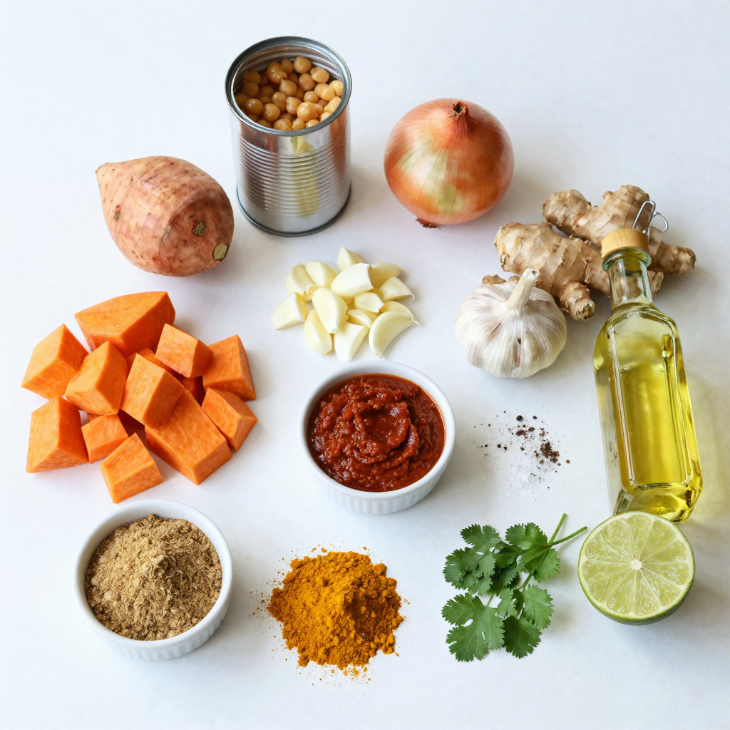 Sweet potatoes bring a natural sweetness to the curry. They add texture and nutrients. Chickpeas provide protein and fiber, making the dish hearty. Onions, garlic, and ginger build a flavorful base. Coconut milk adds creaminess and balances the spices. Red curry paste gives it that warm, spicy kick. Cumin and turmeric deepen the flavors and add health benefits.