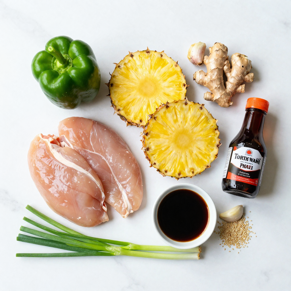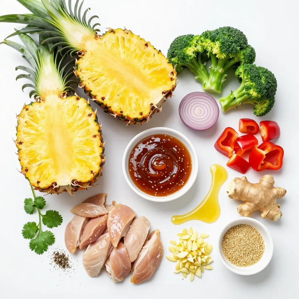 The main ingredients are fresh and bright. The ripe pineapples bring sweetness. The chicken adds protein. Teriyaki sauce gives a delicious glaze. The veggies add crunch and color.