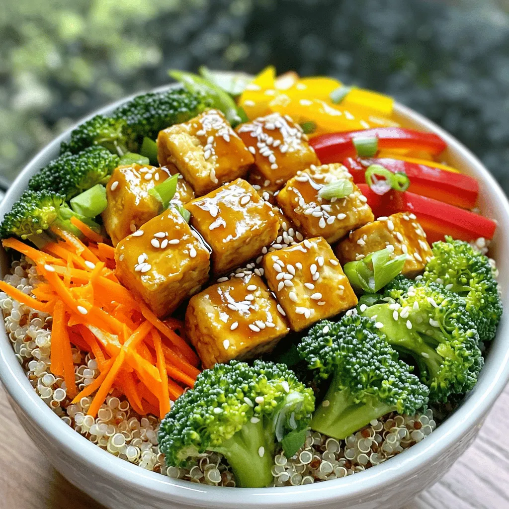 - 1 block (14 oz) firm tofu, drained and pressed - 1 cup cooked brown rice or quinoa - 1 cup broccoli florets - 1 cup shredded carrots - 1 bell pepper, sliced (any color) - 2 green onions, sliced - 1 tablespoon sesame oil - 1 tablespoon olive oil - 1/4 cup soy sauce (or tamari for gluten-free) - 2 tablespoons maple syrup - 1 tablespoon rice vinegar - 1 teaspoon minced garlic - 1 teaspoon grated ginger - 1 tablespoon sesame seeds for garnish Each serving of the Teriyaki Tofu Buddha Bowl is packed with nutrients. You get about 400 calories, 20 grams of protein, 50 grams of carbs, and 15 grams of fats. This bowl is a great balance of macronutrients. The ingredients offer many health benefits. Tofu serves as a fantastic source of plant protein. Brown rice or quinoa adds fiber and essential minerals. Broccoli is rich in vitamins C and K, while carrots provide beta-carotene. Bell peppers can boost your immune system as well. Green onions add flavor and nutrients without many calories. Eating this bowl can support a healthy diet and keep you energized. The blend of flavors and textures makes every bite enjoyable. It's not just a meal; it’s a feast for your body and spirit. For the full recipe, check the details above. First, press the tofu to remove excess water. Wrap it in a clean towel and place a heavy object on top for about 15 minutes. This helps the tofu absorb flavors better. After pressing, cut the tofu into small cubes. Next, make the teriyaki marinade. In a bowl, mix together: - 1/4 cup soy sauce (or tamari for gluten-free) - 2 tablespoons maple syrup - 1 tablespoon rice vinegar - 1 teaspoon minced garlic - 1 teaspoon grated ginger Gently add the tofu cubes to the marinade and stir to coat. Let the tofu soak in the flavors for at least 15 minutes. While the tofu marinates, cook your grains. You can use either brown rice or quinoa. Follow the package instructions for cooking. For perfect grains, use a 2:1 ratio of water to grains. Here’s a tip: After cooking, let the grains sit covered for 5 minutes. This helps them fluff up nicely. Heat a large skillet or wok over medium heat. Add 1 tablespoon of olive oil. Sauté the broccoli and bell pepper for about 4-5 minutes. You want them to be tender but still crisp. Then, add 1 cup of shredded carrots and cook for another 2 minutes. Remove the skillet from the heat and set the vegetables aside. In the same skillet, add 1 tablespoon of sesame oil and heat it over medium-high. Carefully place the marinated tofu cubes in the skillet. Cook for about 5-7 minutes. Turn the tofu occasionally until it is golden brown and slightly crispy. The right oil helps achieve that perfect texture. Now, it’s time to put everything together! Start with a base of cooked brown rice or quinoa in a deep bowl. Layer the sautéed vegetables on top of the grains. Finally, add the crispy teriyaki tofu. For a beautiful presentation, arrange the ingredients in sections. This adds color and makes the dish more appealing. You can also sprinkle some sliced green onions and sesame seeds on top for extra flavor and crunch. Enjoy your Teriyaki Tofu Buddha Bowl! For the complete recipe, check out [Full Recipe]. To make your Teriyaki Tofu Buddha Bowl burst with flavor, focus on your marinade. A great mix includes: - 1/4 cup soy sauce or tamari for gluten-free - 2 tablespoons maple syrup - 1 tablespoon rice vinegar - 1 teaspoon minced garlic - 1 teaspoon grated ginger Letting the tofu soak in this marinade for at least 15 minutes enhances the taste. You can even marinate it longer for a stronger flavor. When cooking, use medium-high heat to get a nice sear on your tofu. This step locks in the flavor and gives it a delightful crunch. Stir-fry the veggies quickly. This keeps them vibrant and crisp. A beautiful bowl is all about colors and textures. Here’s how to make it pop: - Start with a base of brown rice or quinoa. - Layer the sautéed veggies in sections. - Place the crispy tofu on top. - Add a sprinkle of green onions and sesame seeds for crunch. This layout not only looks good but also makes it easy to enjoy each bite. Drizzle a bit of extra teriyaki sauce over the top for shine and flavor. You can easily change this bowl to fit your taste. Here are some ideas: - Swap tofu for tempeh or chickpeas for added protein. - Try adding different vegetables like spinach, corn, or snap peas. - For a gluten-free option, use tamari instead of soy sauce. - For a low-carb version, consider cauliflower rice instead of grains. These simple swaps keep your meals fresh and exciting while catering to your dietary needs. For the full recipe, check out my detailed guide. {{image_2}} You can switch tofu for other proteins. Tempeh is a great choice. It has a nutty flavor and a firm texture. Chickpeas are another option; they add protein and fiber. For tempeh, cook it for about 7-10 minutes until golden. If using chickpeas, add them to the pan for just a few minutes to warm up. Don’t feel stuck with just brown rice. Quinoa is a fantastic alternative. It cooks quickly and is packed with protein. Farro adds a chewy texture and a nutty taste. If you want a low-carb option, try cauliflower rice. Each grain brings different health benefits. Quinoa is high in protein, while farro has fiber. The teriyaki sauce can be boosted with spices. Add a pinch of red pepper flakes for heat. You can also stir in some orange zest for a citrus kick. For toppings, consider avocado for creaminess or nuts for crunch. These little touches make your bowl unique and tasty. Explore various toppings to find your favorite mix. To keep your Teriyaki Tofu Buddha Bowl fresh, store it in airtight containers. Glass containers work best as they do not absorb odors. Make sure the bowl is cool before sealing it. This helps avoid moisture build-up, which can make the food soggy. Store any leftover rice or quinoa separately to keep them fluffy. Reheat your tofu and vegetables gently. The microwave is quick, but it can make the to