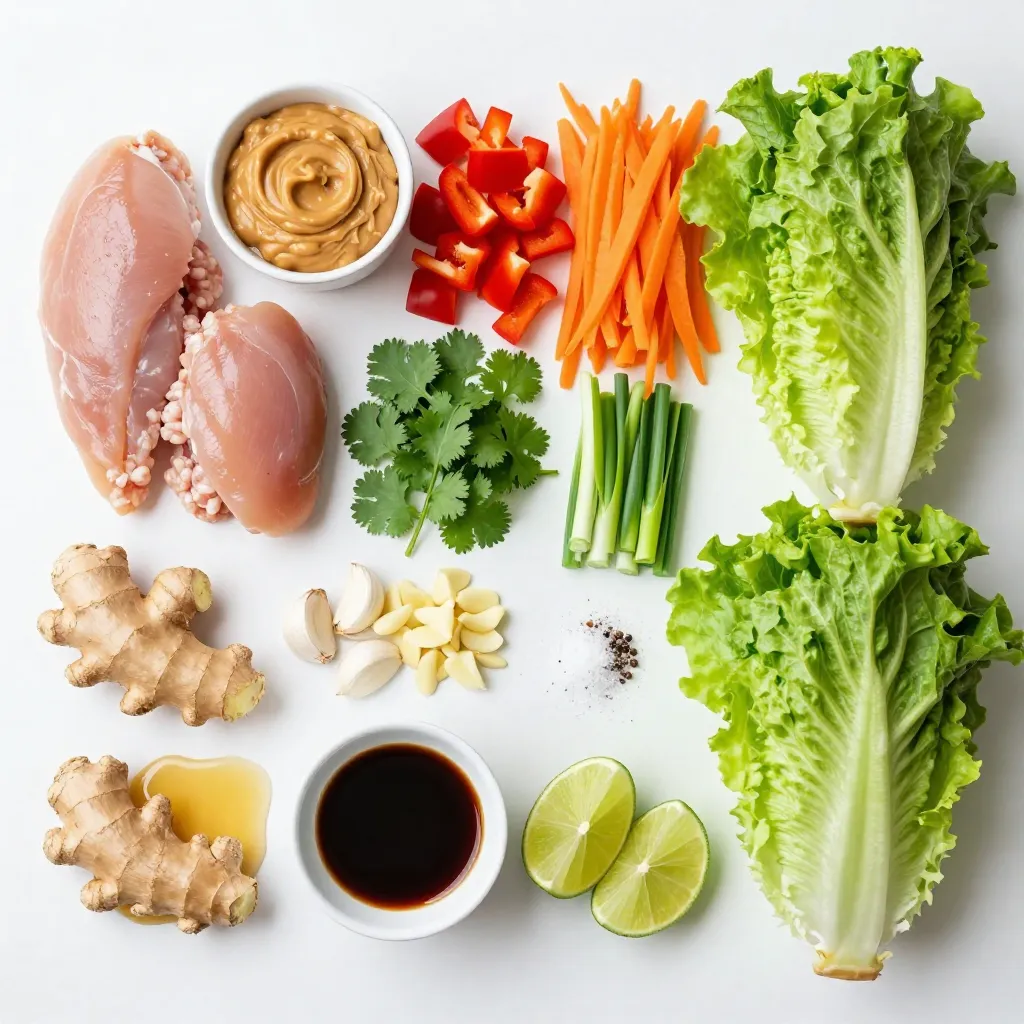 The main ingredients for Thai Peanut Chicken Lettuce Wraps create a vibrant dish. The chicken thighs provide rich flavor and tenderness. Garlic and ginger add a fragrant kick. The red bell pepper and shredded carrots bring both color and crunch to the wraps. Green onions and cilantro enhance freshness. The peanut butter, soy sauce, lime juice, and honey blend into a creamy sauce that ties everything together.