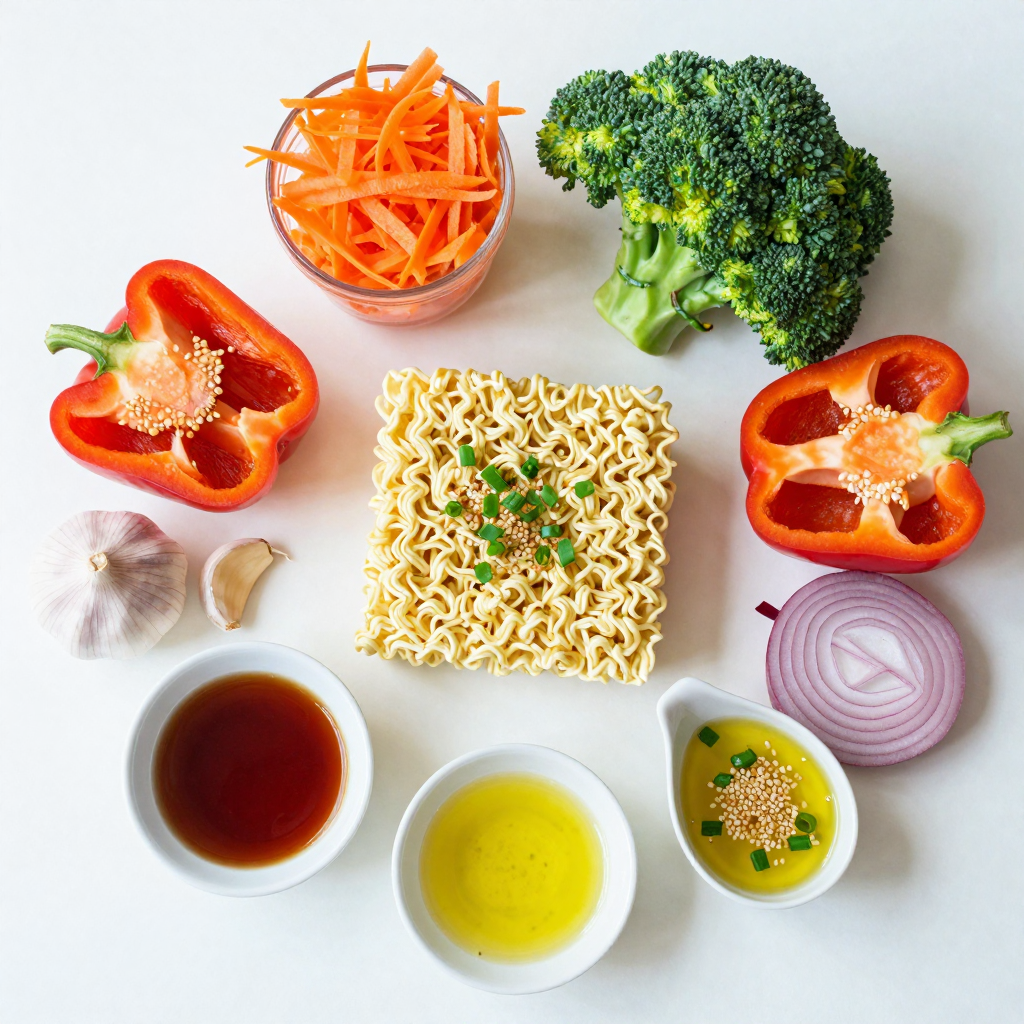 To make TikTok Ramen Stir Fry, you need simple and fresh ingredients. First, grab two packs of instant ramen noodles. You will discard the seasoning packets. Next, gather one cup of shredded carrots and one cup of broccoli florets. Add one bell pepper, any color you like, sliced into strips. You will also need a small red onion, sliced thin.