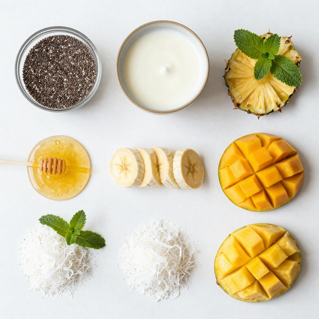 Fresh fruit makes this pudding bright and fun. You will need 1 ripe banana, sliced. Bananas add creaminess and natural sweetness. Next, grab 1 cup of diced mango. Mango gives a juicy texture and tropical taste. Then, get 1 cup of diced pineapple which adds a tangy kick. To finish, include 1/2 cup of unsweetened shredded coconut. This adds a nice chewy texture. You can also use fresh mint leaves for garnish to brighten up the dish.