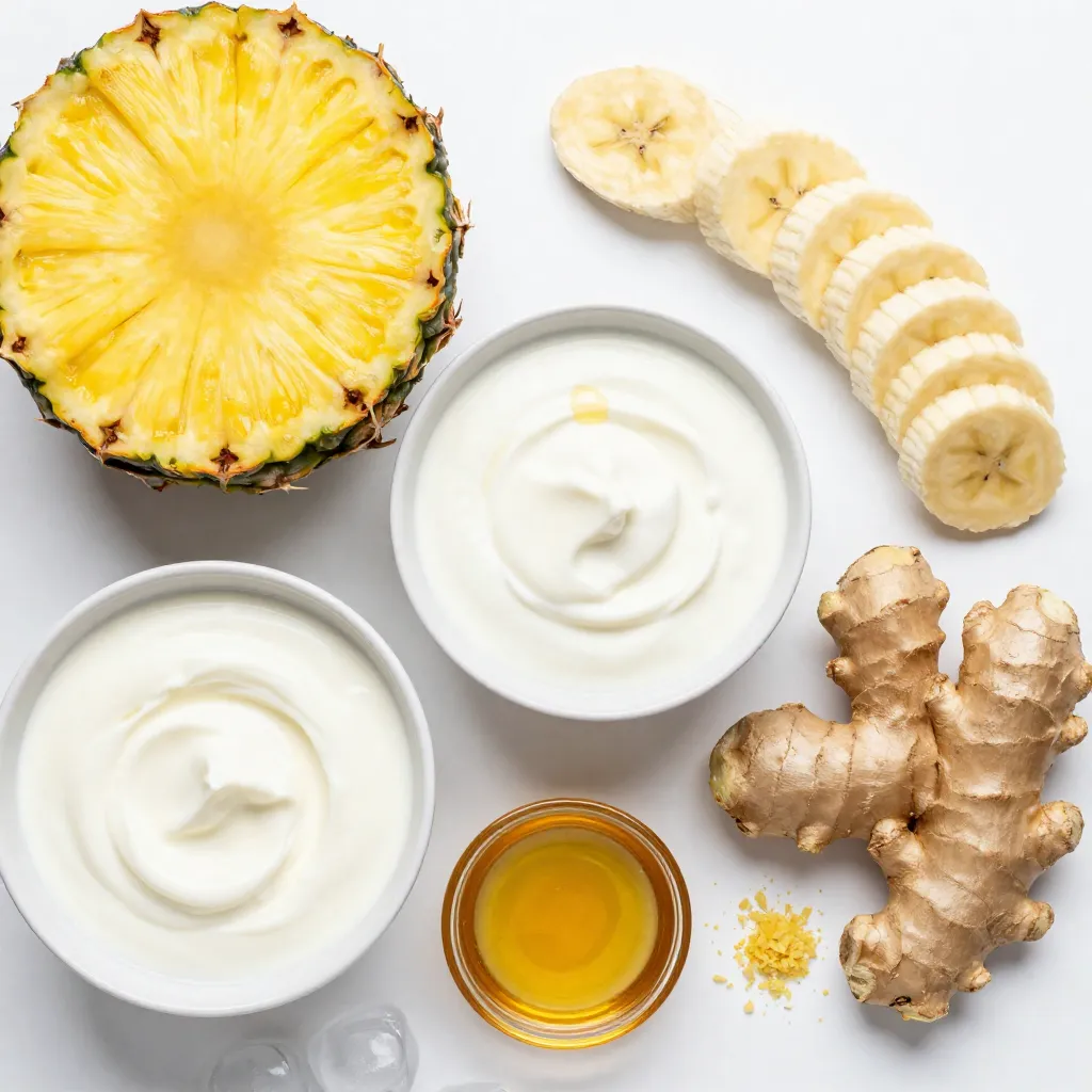 Now it’s time to blend. Put the pineapple and banana into the blender first. Next, pour in the coconut milk and Greek yogurt. Add the ginger and any sweetener you chose. If you want ice, add it now. Blend on high speed. Keep blending for about 30 to 60 seconds. Stop to check the texture. It should be smooth and creamy. If it needs more sweetness, add a bit more honey or syrup. Blend again for a few seconds.
