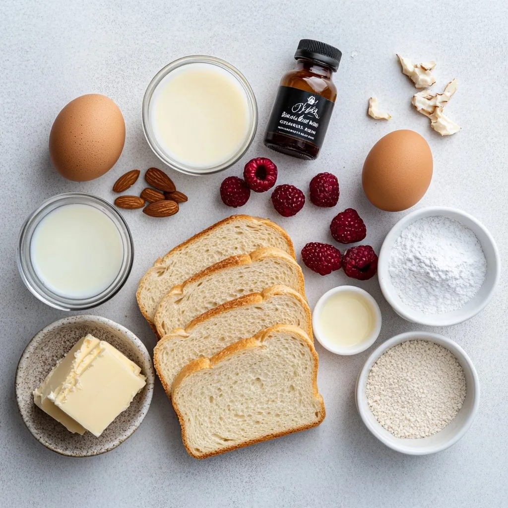 To make Vanilla Almond French Toast, gather these ingredients first. I love using thick-cut brioche bread because it soaks up the egg mixture well. The egg mixture is where the magic happens!