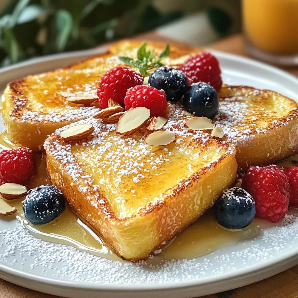 - 4 slices of thick-cut brioche bread - 2 large eggs - 1 cup milk (or almond milk) - 1 teaspoon vanilla extract - 1 teaspoon almond extract - ¼ cup almond meal - 1 tablespoon sugar (optional) - 1 tablespoon butter or coconut oil - Powdered sugar for dusting - Fresh berries for garnish (optional) - Slivered almonds for topping (optional) To make Vanilla Almond French Toast, gather these ingredients first. I love using thick-cut brioche bread because it soaks up the egg mixture well. The egg mixture is where the magic happens! You’ll need two large eggs for a rich base. Next, add 1 cup of milk. You can use regular milk or almond milk for a nutty flavor. Don’t forget the extracts! One teaspoon of vanilla and one teaspoon of almond extract bring in that sweet aroma. Almond meal adds a lovely texture and flavor. You can use ¼ cup for a nutty twist. If you like your French toast a bit sweeter, add 1 tablespoon of sugar, but it's not a must. For cooking, use 1 tablespoon of butter or coconut oil to get that golden crust. Finally, finish the dish with powdered sugar on top, and add fresh berries or slivered almonds if you like extra flair. Each ingredient plays a role in creating a delightful breakfast treat. So, let’s get started on making it! {{ingredient_image_1}} Start by grabbing a mixing bowl. Crack the two large eggs into it. Add one cup of milk or almond milk for a nutty twist. Then, pour in one teaspoon of vanilla extract and one teaspoon of almond extract. These extracts give the French toast a rich flavor. Next, sprinkle in a quarter cup of almond meal. This adds a nice texture and nutty taste. If you like it sweeter, add one tablespoon of sugar. Whisk all the ingredients together until everything is well mixed. The mixture should be smooth and creamy. Now, it’s time to cook! Preheat your non-stick skillet or griddle over medium heat. Add one tablespoon of butter or coconut oil, letting it melt and coat the skillet evenly. While it heats, dip each slice of thick-cut brioche bread into the egg mixture. Make sure to soak it for a few seconds on each side. You want it coated but not too soggy. Once your skillet is hot, place the soaked bread slices on it. Cook for about 3-4 minutes on each side. Look for a golden brown color and a slightly crispy texture. Once all the slices are cooked, it’s time to serve! Place the warm French toast on a plate. Dust each slice with powdered sugar for a sweet touch. For extra flavor, top with fresh berries and slivered almonds. Berries add a bright color and a burst of freshness. Slivered almonds give a nice crunch. You can also serve it with maple syrup for a classic finish. Enjoy your delightful breakfast treat! To boost the vanilla and almond flavor, consider these tips: - Use fresh vanilla beans instead of extract for a richer taste. - Add a pinch of salt to balance sweetness. - Mix in a dash of almond extract for more depth. - Top with real maple syrup for added complexity. To achieve the perfect golden brown texture: - Preheat your skillet or griddle well before cooking. This helps in even cooking. - Use medium heat to avoid burning the bread. - Cook each side for 3-4 minutes, flipping once. - Look for a crispy edge and a soft center to ensure the best bite. Avoid these common mistakes for better results: - Don’t soak the bread too long. It should be coated, not soggy. - Use thick-cut brioche to prevent quick sogginess. - Watch the heat; too high can burn the outside while leaving the inside raw. - Don’t rush the cooking time; golden brown takes patience. Pro Tips Choose the Right Bread: Thick-cut brioche or challah works best for French toast, as they soak up the custard without falling apart. Let It Soak: Allow the bread to soak in the egg mixture for a few seconds on each side to ensure a rich, custardy center. Cooking Temperature: Keep your skillet at medium heat to achieve a golden brown crust without burning the outside. Customize Toppings: Feel free to add your favorite toppings, such as maple syrup, whipped cream, or seasonal fruits for extra flavor. {{image_2}} You can switch up the bread for your Vanilla Almond French Toast. Try using sourdough or whole wheat bread. Sourdough gives a nice tang, while whole wheat adds a hearty texture. These options can make your dish unique and tasty. Just make sure the bread is thick-cut for the best results. Adding spices can elevate your French toast. A pinch of cinnamon or nutmeg adds warmth and a cozy feel. You can even mix in a bit of cocoa powder for a chocolate twist. These flavors blend well with the vanilla and almond, creating a rich experience in every bite. You can make this dish dairy-free by using almond milk instead of regular milk. This keeps the nutty flavor strong. For gluten-free options, choose gluten-free bread. This way, everyone can enjoy this breakfast treat, no matter their diet. To store leftover French toast, let it cool first. Place the slices in an airtight container. You can keep them in the fridge for up to three days. This helps maintain their flavor and texture. For the best results, reheat your French toast in a skillet. Heat it over medium heat for about two minutes on each side. This method keeps it crispy and warm. You can also use an oven. Preheat it to 350°F (175°C). Place the slices on a baking sheet and warm them for about 10 minutes. Yes, you can freeze French toast! First, let it cool completely. Wrap each slice in plastic wrap and then place them in a freezer bag. This keeps them fresh for up to two months. When you're ready to eat, thaw them in the fridge overnight. Then, reheat as mentioned above for a delightful breakfast treat. You can swap brioche with other types of bread like: - Challah - Sourdough - Whole wheat - French bread - Gluten-free bread Each choice brings its flavor and texture. Challah is soft and sweet. Sourdough adds a nice tang. Whole wheat offers a hearty taste, while gluten-free bread fits dietary needs. If you want a ve