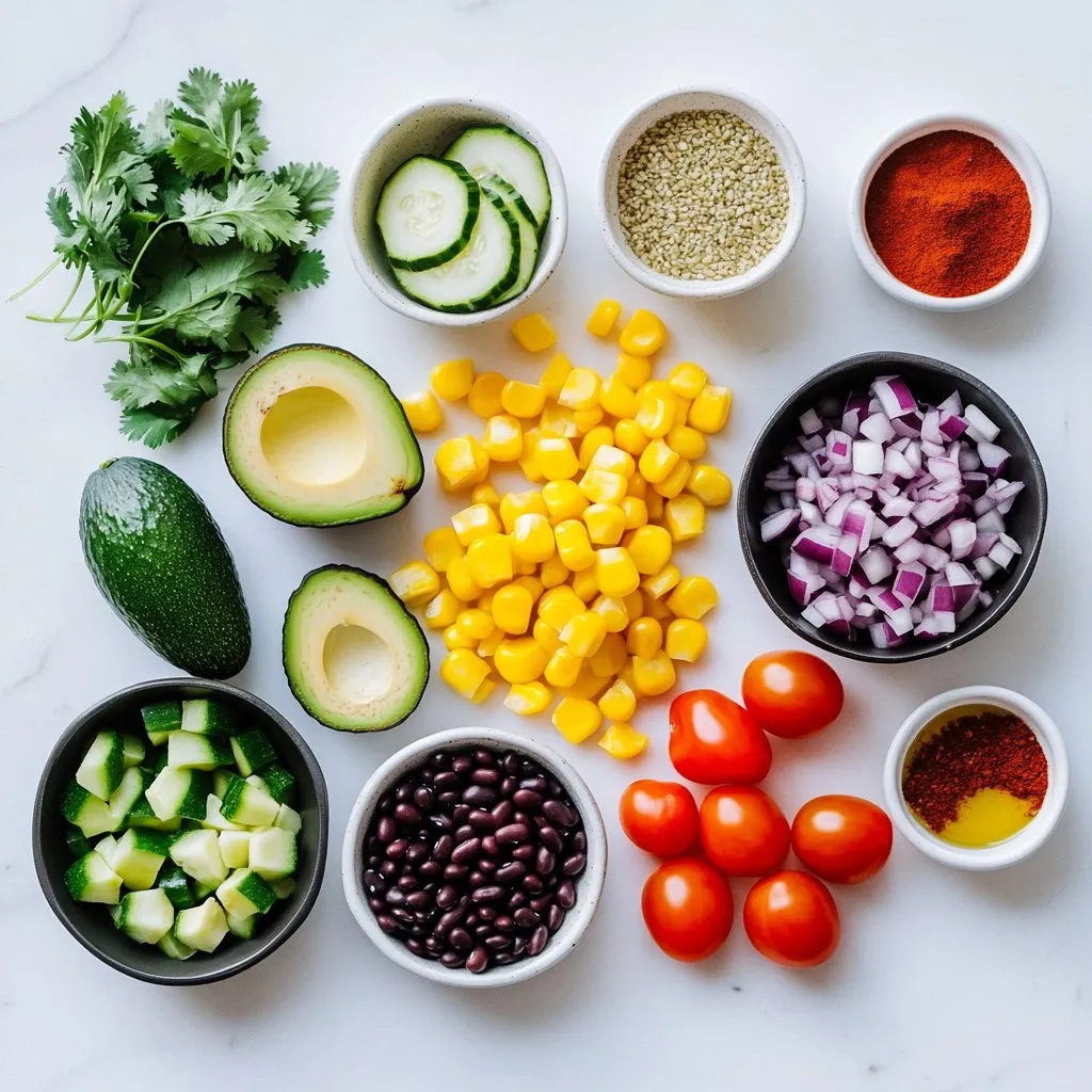 You need brown rice for a hearty base. It gives fiber and taste. Black beans add protein and a creamy texture. I love using corn for sweetness, and the diced bell peppers and zucchini bring color and crunch. Red onion adds a slight bite, while fresh cilantro ties it all together with its bright flavor.